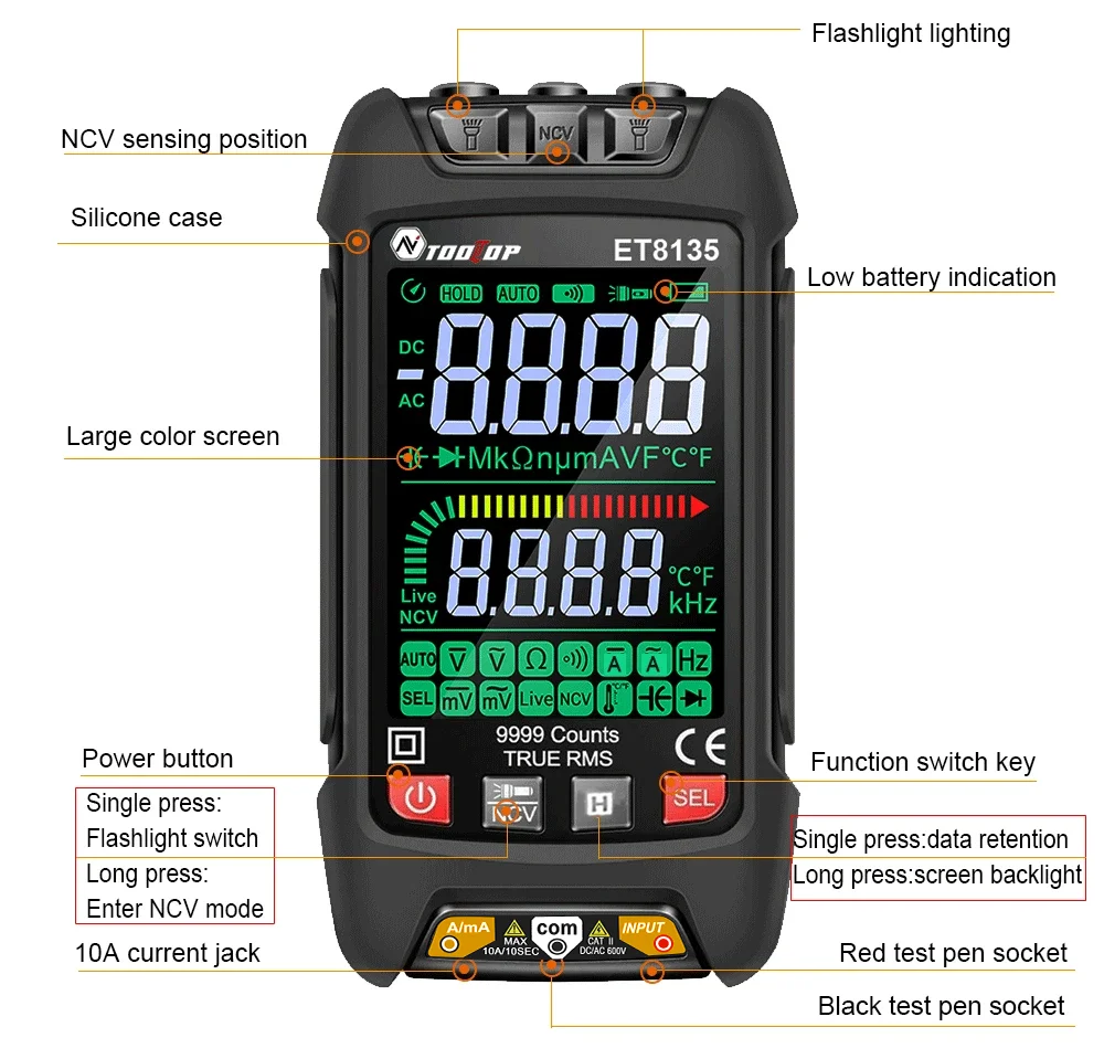 DC/AC Voltage DC/AC Current/Resistance/Diode/Capacitor/NCV/Frequency/Temperature Measurement