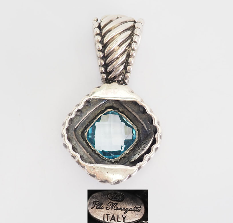 Ciondolo vintage in argento sterling e topazio azzurro sfaccettato di Flli Menegatti. Misura 1,4 x 0,8 pollici. Il peso è di 12,5 grammi. Ottime condizioni.