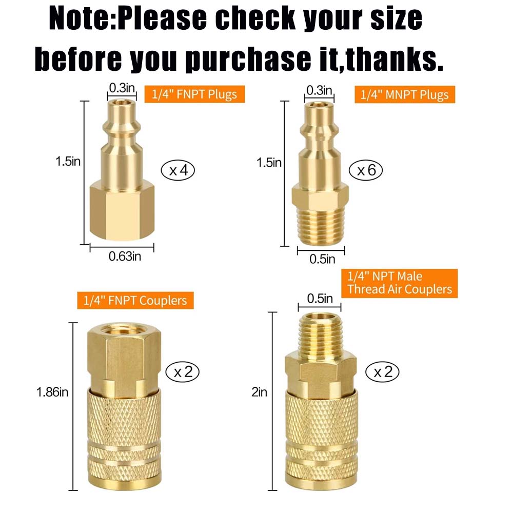 【14 Pieces Kit】- Air coupler and plug kit includes 2pcs 1/4" FNPT coupler, 2pcs 1/4" MNPT couplers, 4pcs 1/4" FNPT plugs and 6pcs 1/4" MNPT plugs.