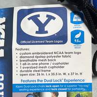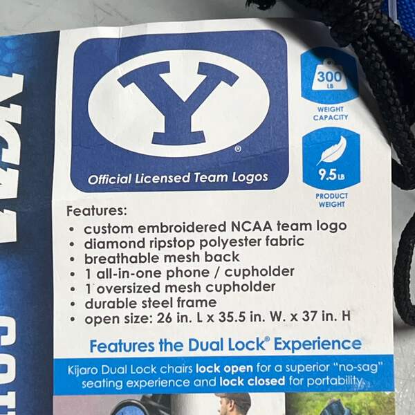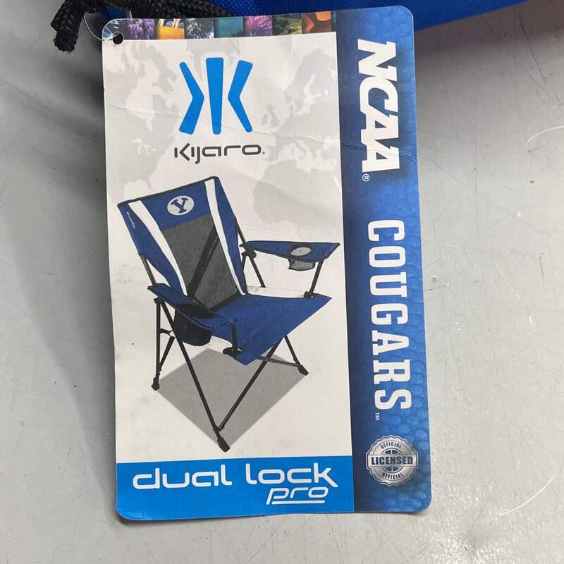 KIJARO Brigham Young University Dual Lock Pro Folding Chair Condition: New Size: 300lb Cap Color: Blue MPN/Model: 12377 Description: Upgrade your tailgating game with the best-selling Kijaro Dual Lock® Chair. Now embroidered with your favorite team’s logo. Show your team spirit while relaxing in the Dual Lock® Pro Chair featuring an oversized upholder, all-in-one cupholder, and team logo on the chair and carry bag. This NCAA camping chair has a weight capacity of 300 pounds but weighs less than 10 pounds. Locking open for comfort and locking closed for easy portability this adult outdoor tailgating chair is the perfect addition to gameday