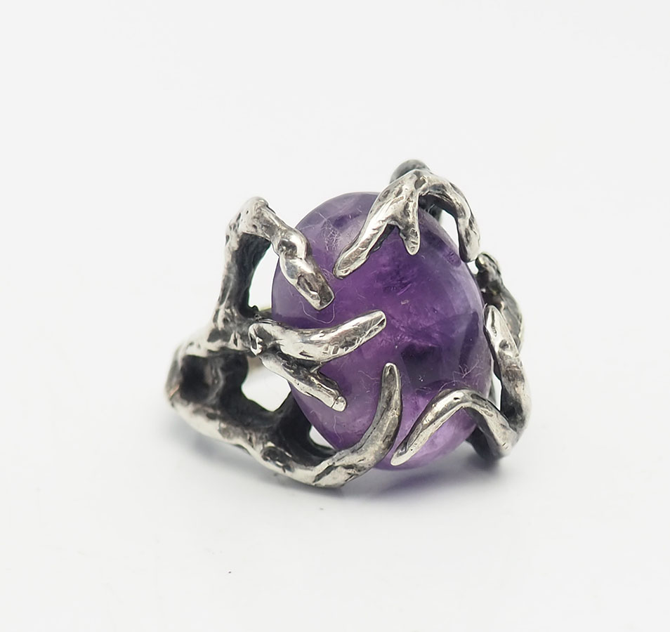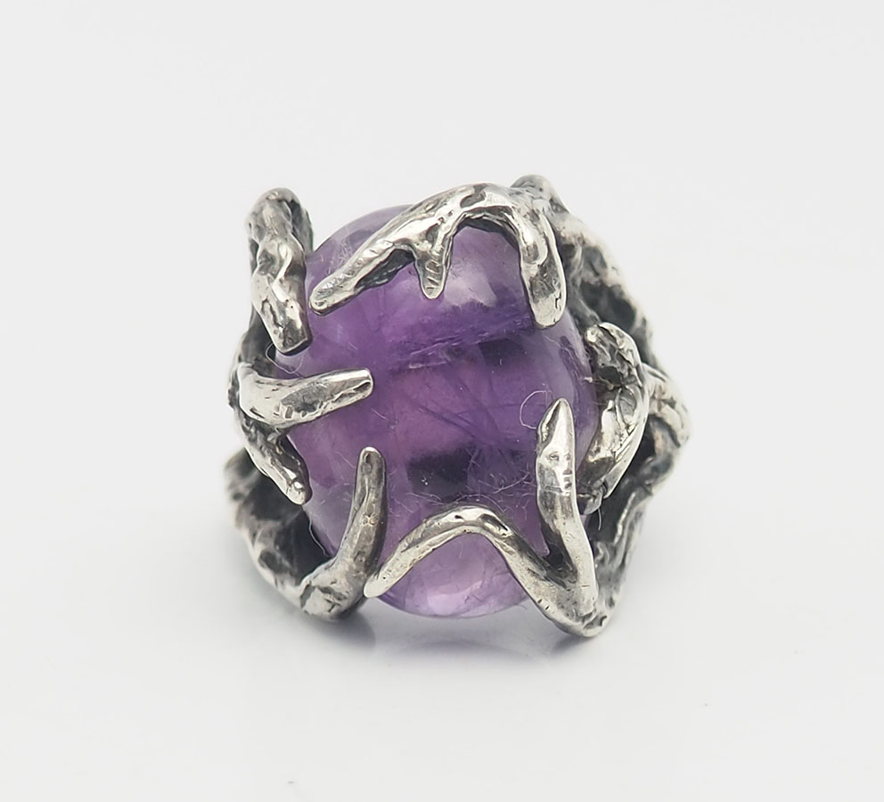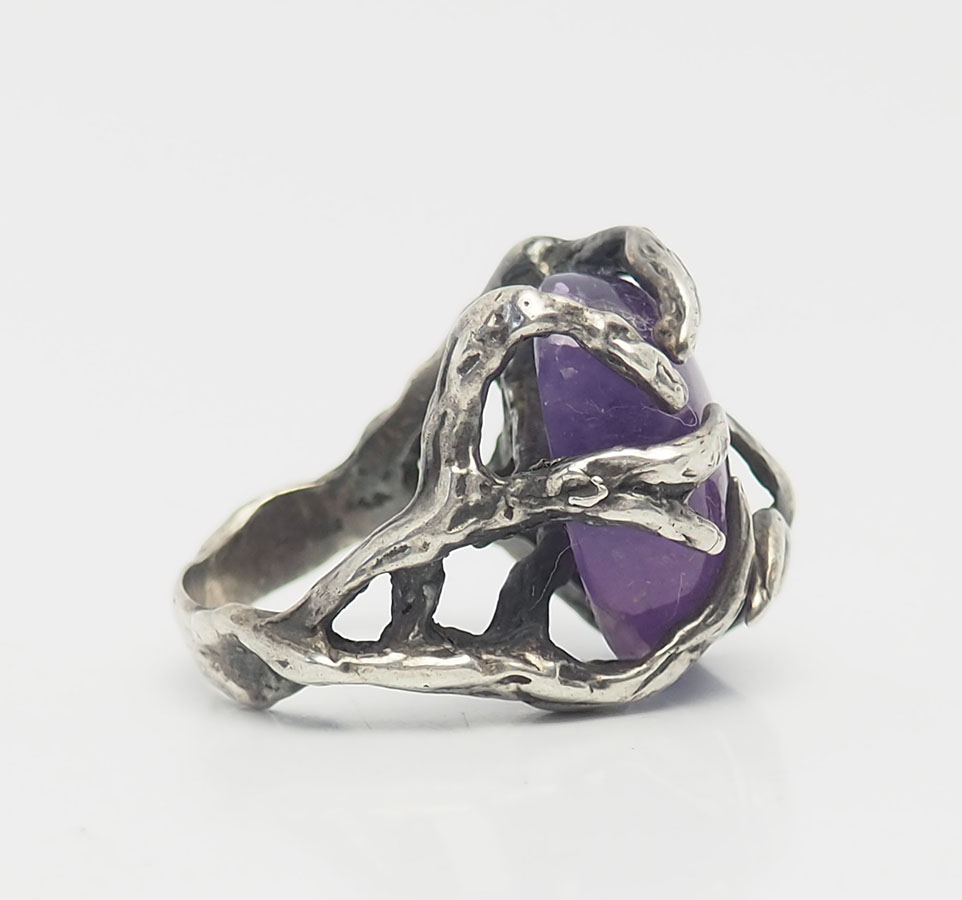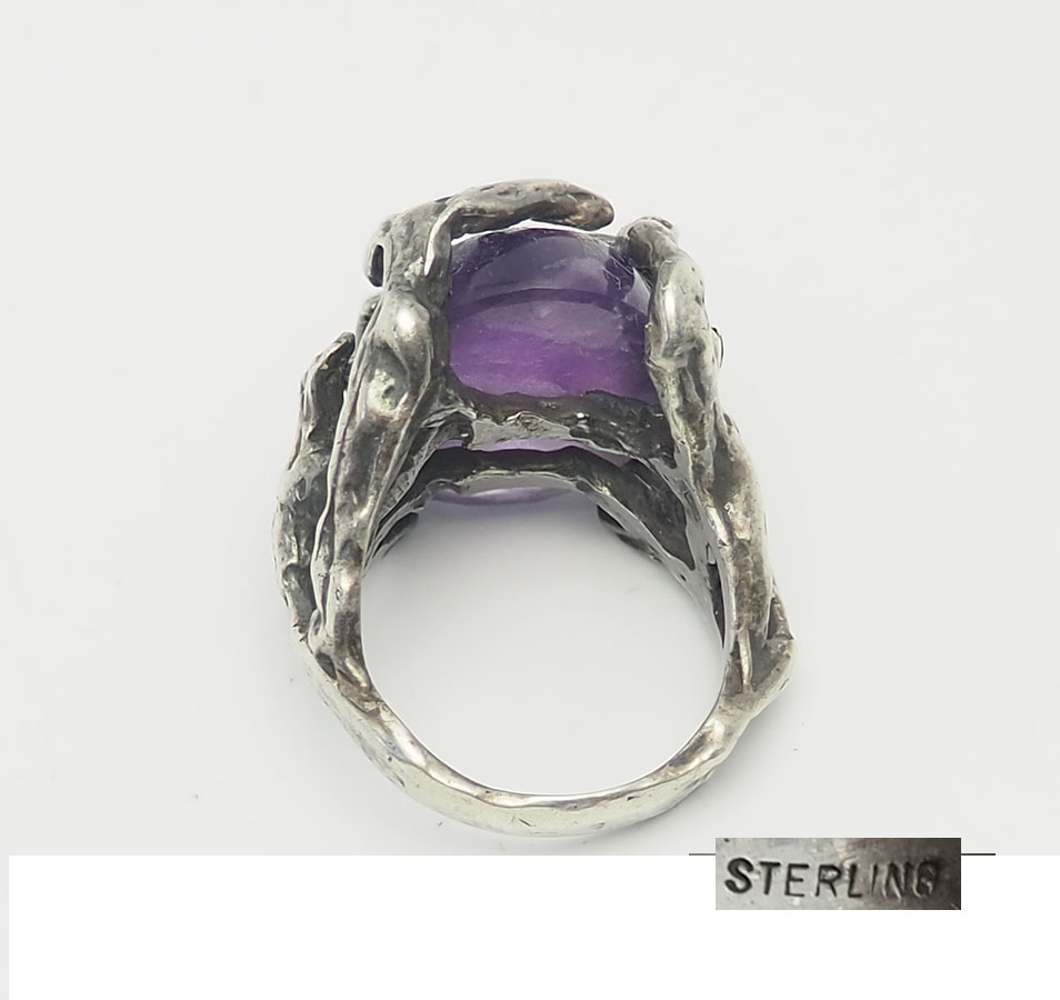 Gorgeous large handmade vintage sterling silver and amethyst ring in size 6.75. Ring face is 1" at widest point. Weight is 12 grams. Very good condition.