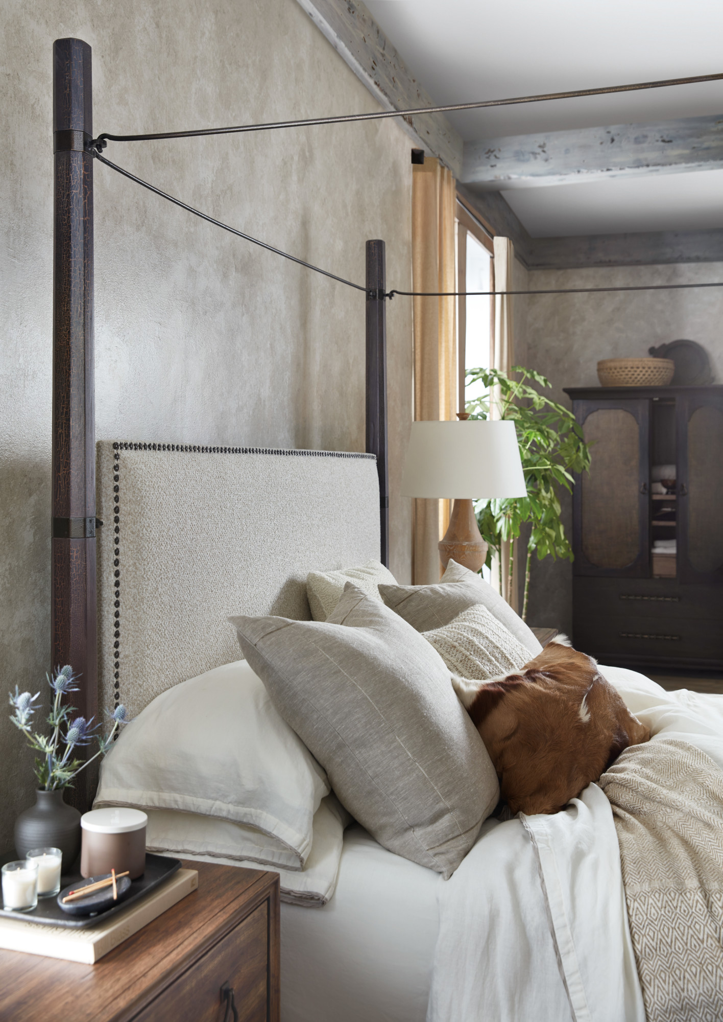 Item DescriptionIt’s the bed that dreams are made of. The Big Sky Corbel Poster Bed is finished in the dramatic Charred Timber with a suspended linen upholstered headboard surrounded by decorative nail heads and an oxidized brushed bronze metal canopy. The Charred Timber finish contrasts with the Saxony Porcelain performance fabric on the headboard. Includes headboard, footboard and rails.