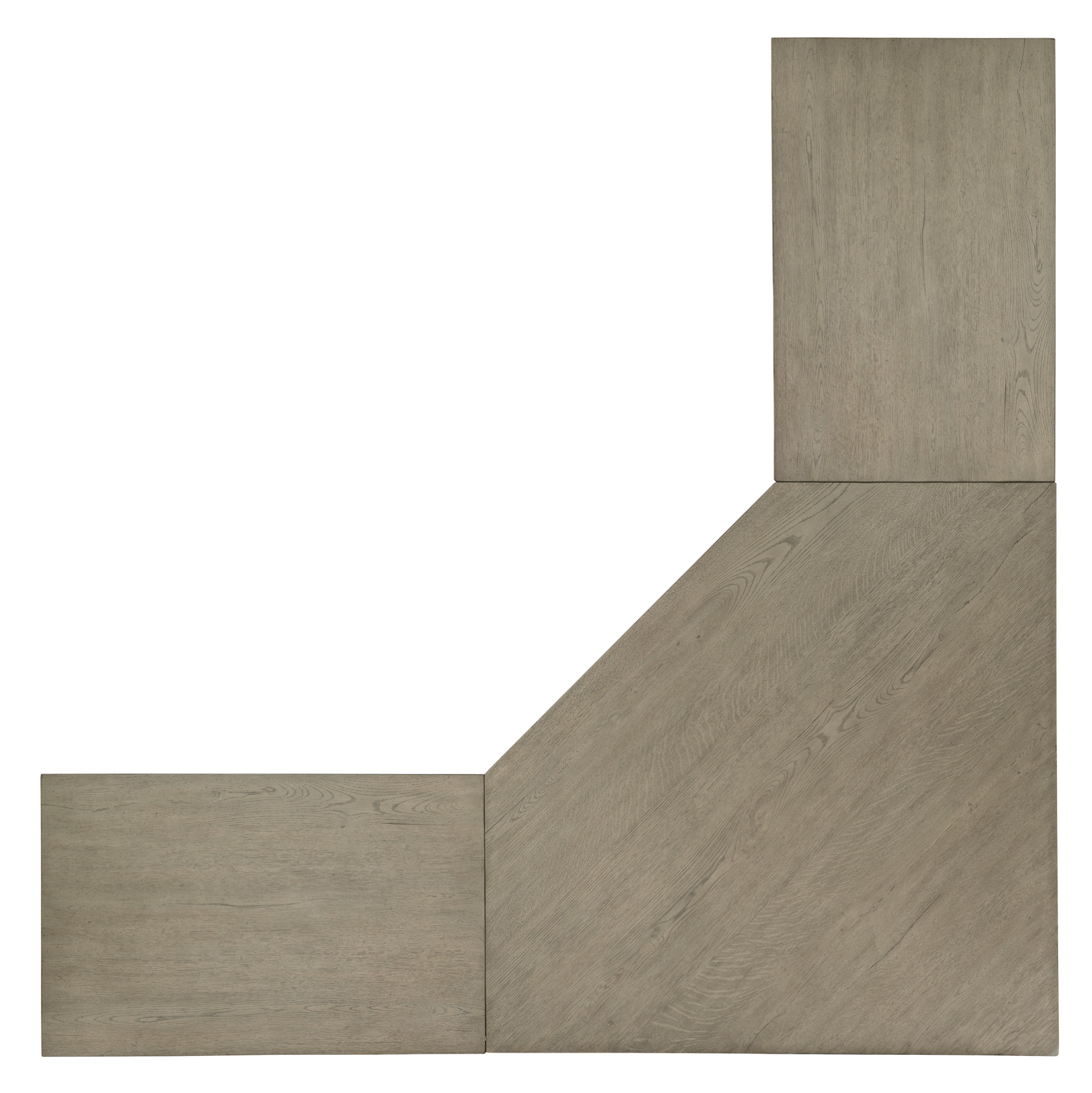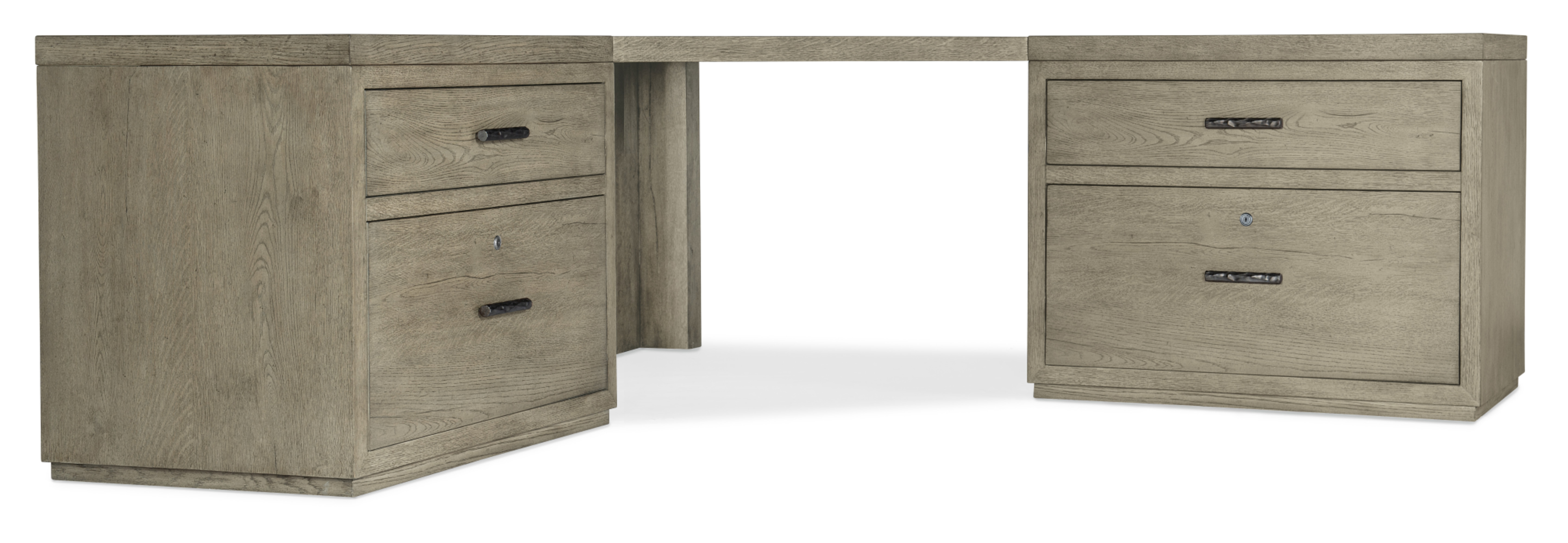 Item DescriptionThe stylish symmetry of the Linville falls corner desk will bring serenity to your life and productivity to your work. Capturing the essence of nature’s organic color palette on a clean-lined and simple silhouette. The unit is crafted of oak veneers with a soft smoked gray mink finish, and combines a corner top with two flanking 36-inch tops. The unit’s functional appeal is enhanced by two lateral files with a total of four drawers, including two top utility drawers and two bottom locking file drawers with pendaflex filing systems. Fully finished on the back so it can be floated in a room.