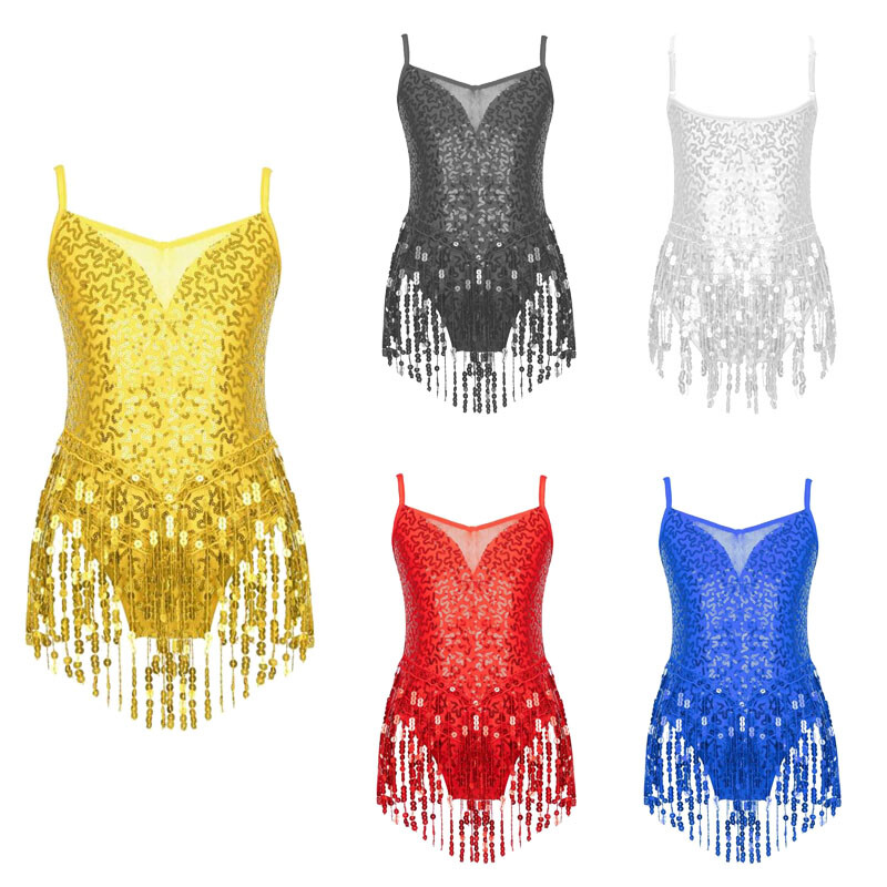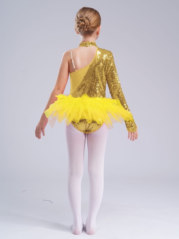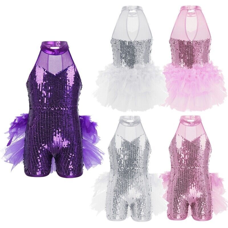 Girls Sequined Tulle Skirted Leotard Dress Modern Jazz Dance Performance Costume