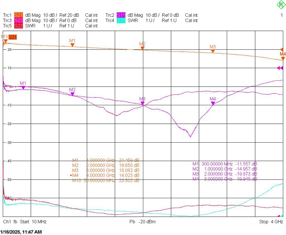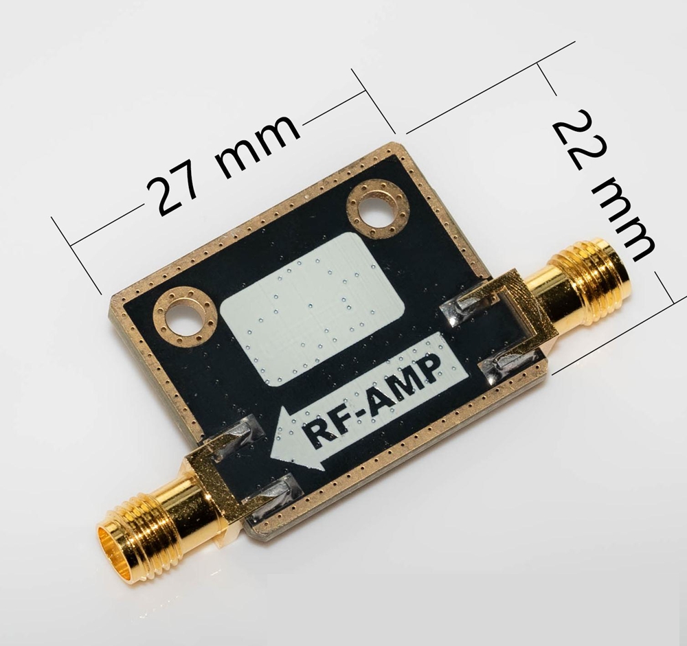 - Gain: 23.5dB at 50MHz; 21.4dB at 1GHz; 19.6dB at 2GHz; 18.0dB at 3GHz; 14.0dB at 4GHz