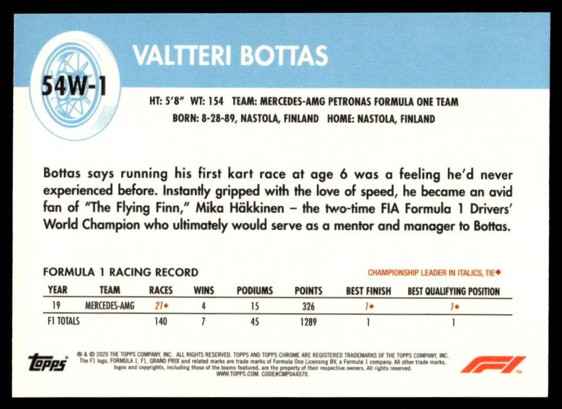 | 2020 Topps Chrome Formula 1 Refractor Valtteri Bottas Mercedes #54W-1 |