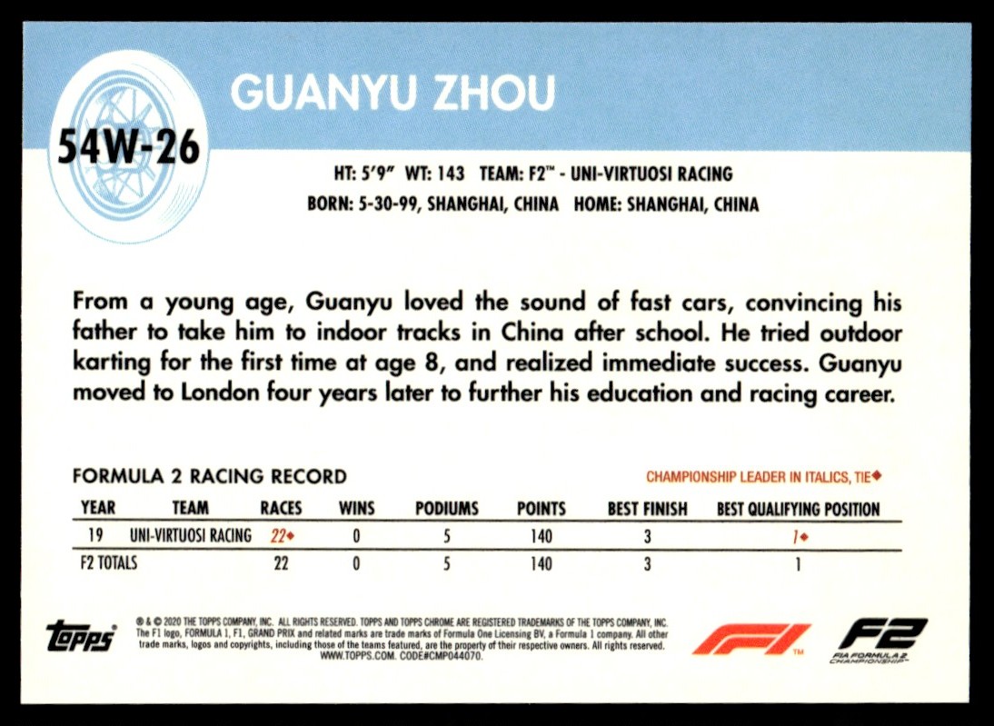 | 2020 Topps Chrome Formula 1 Refractor Guanyu Zhou Uni-Virtuosi Racing F2 #54W-26 |