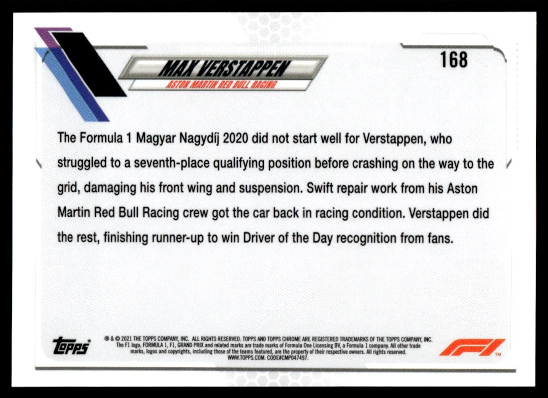 | 2021 Topps Chrome Formula 1 Max Verstappen Aston Martin Red Bull Racing #168 |