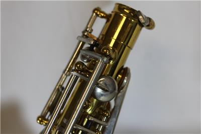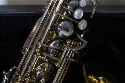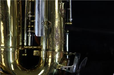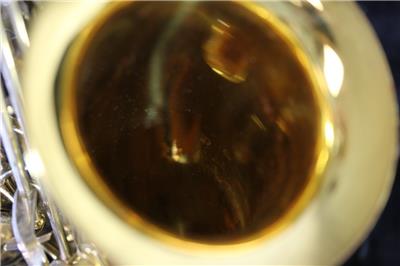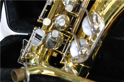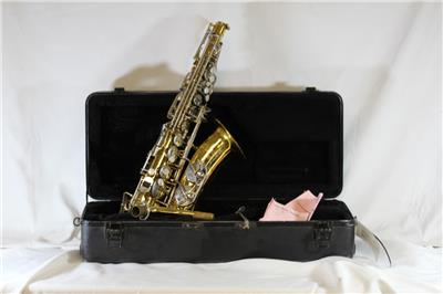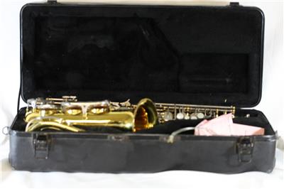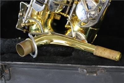 This saxophone is in good pre-owned condition and shows minor wear. No mouthpiece included. Hard case missing handle.