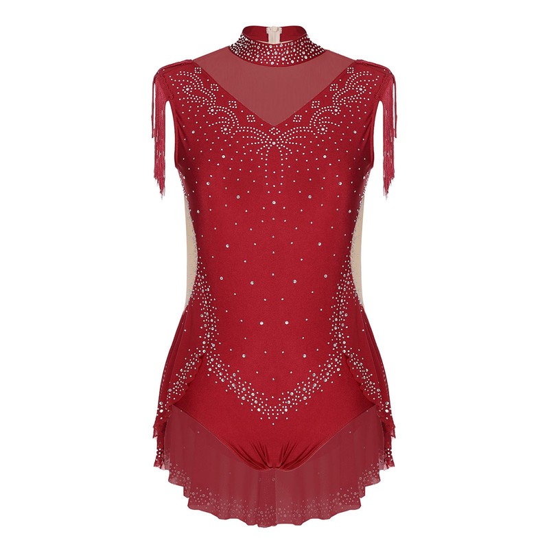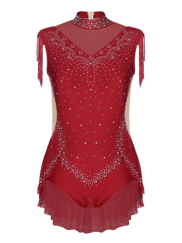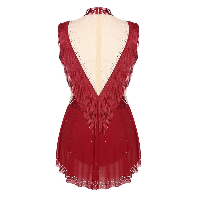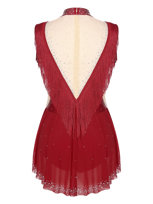 Tassels on the shoulders and back add a sense of movement. The leotard with a panel skirt at the back shows the beauty of dance.