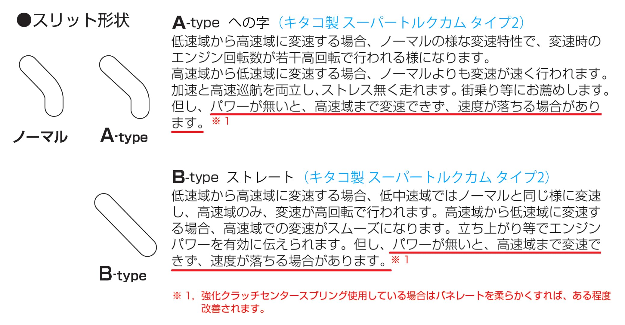 Super Torque Cam allows you to select the gear shifting characteristics according to the degree of tuning of your vehicle by changing the torsion angle and slit shape.