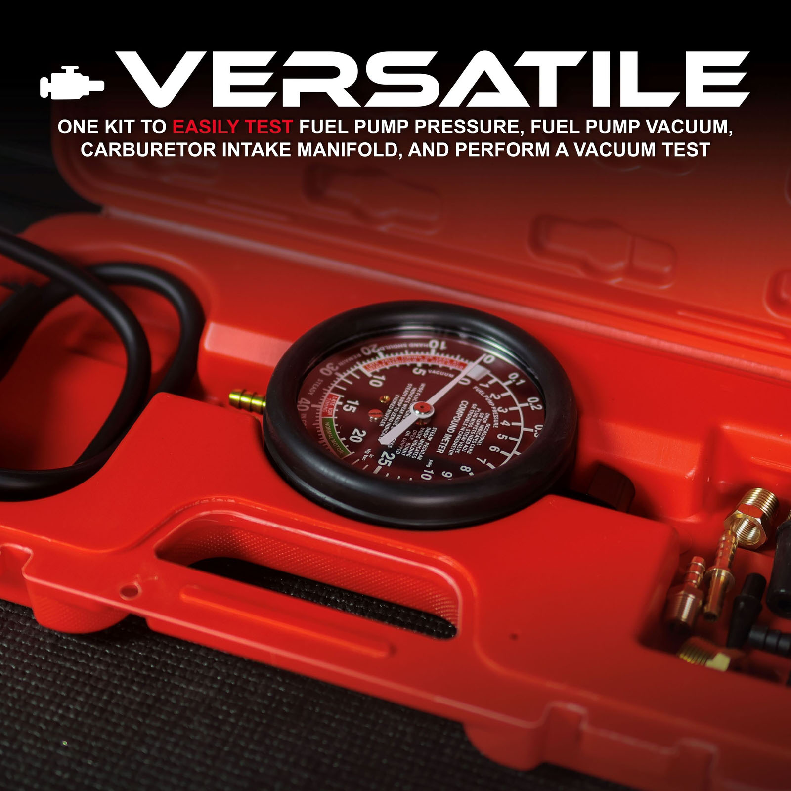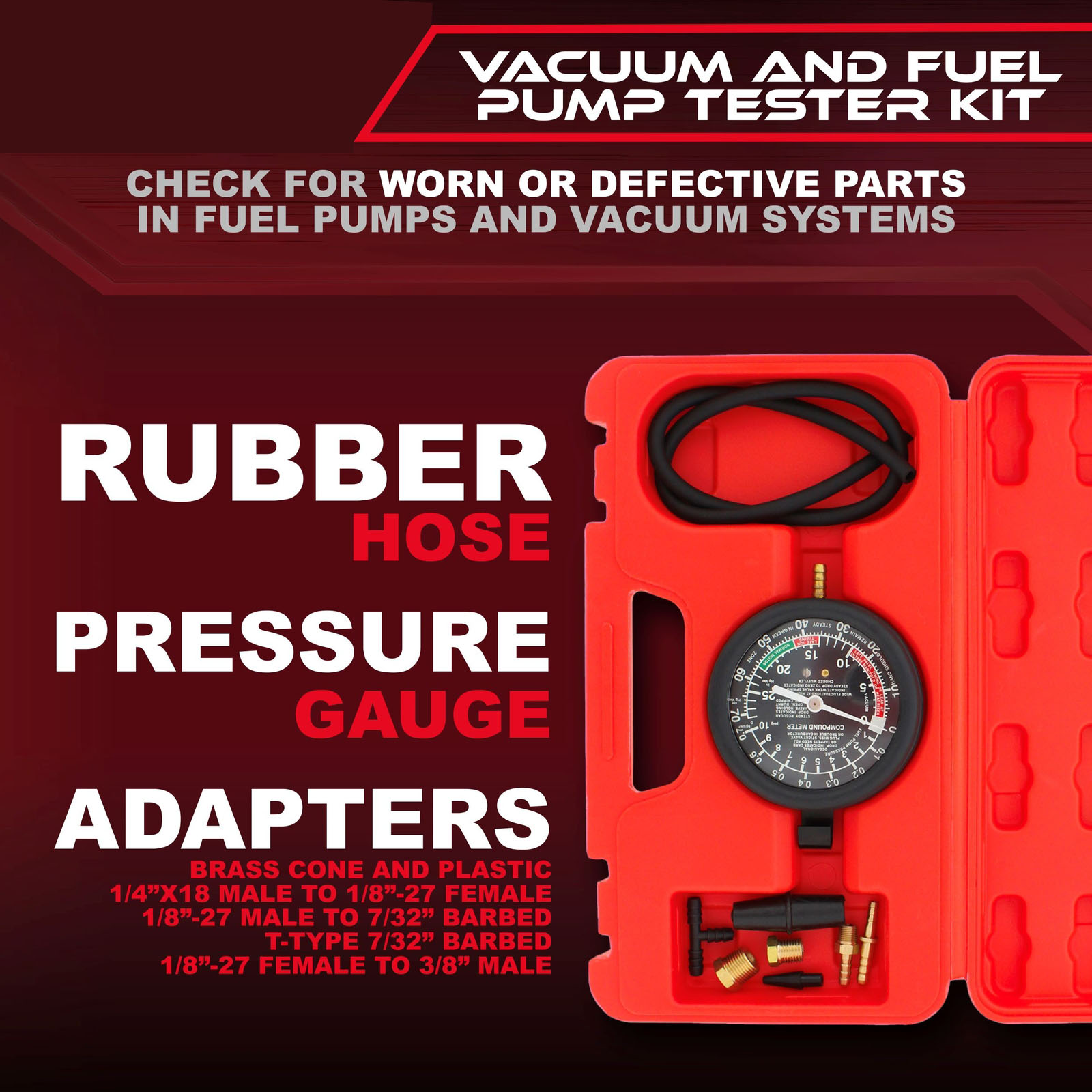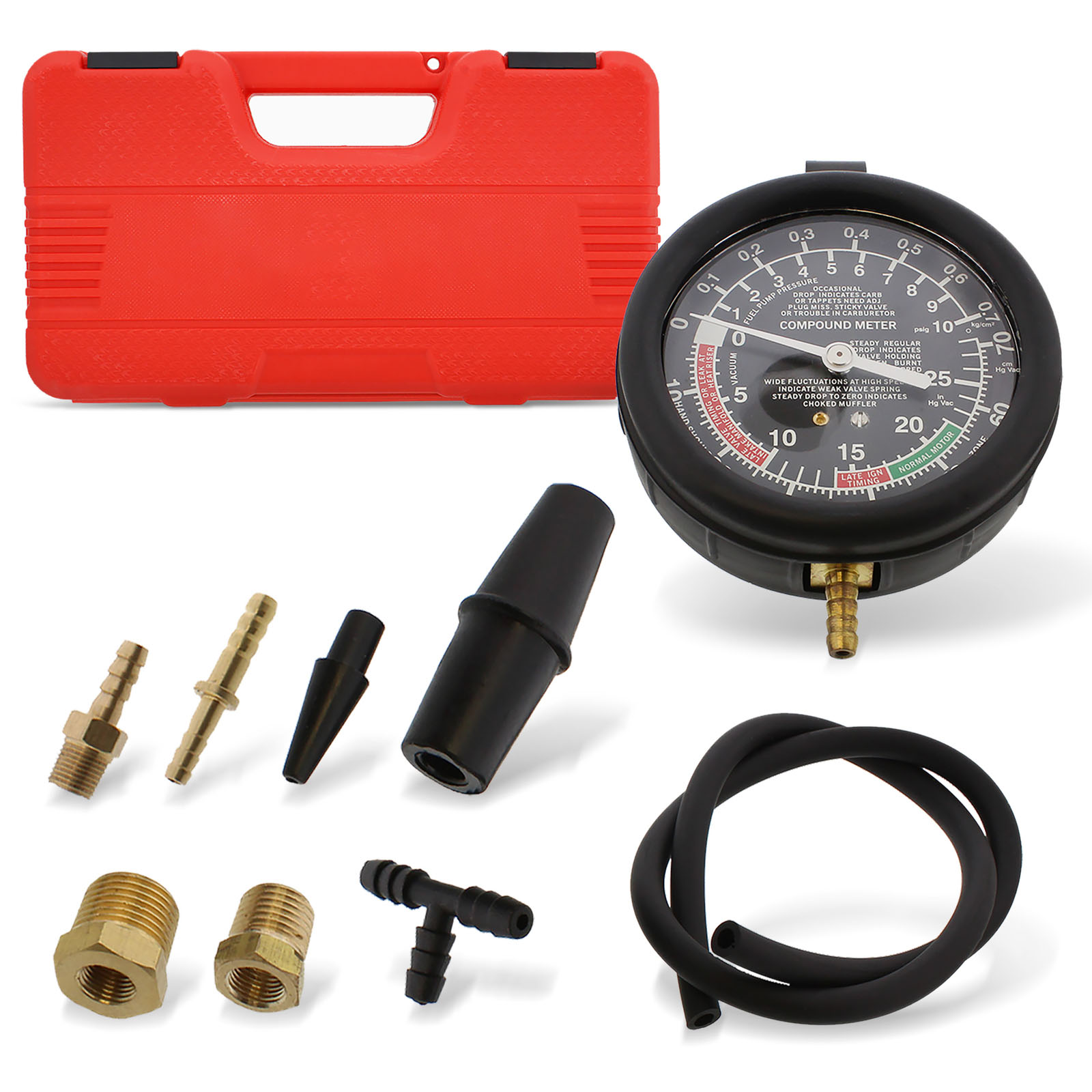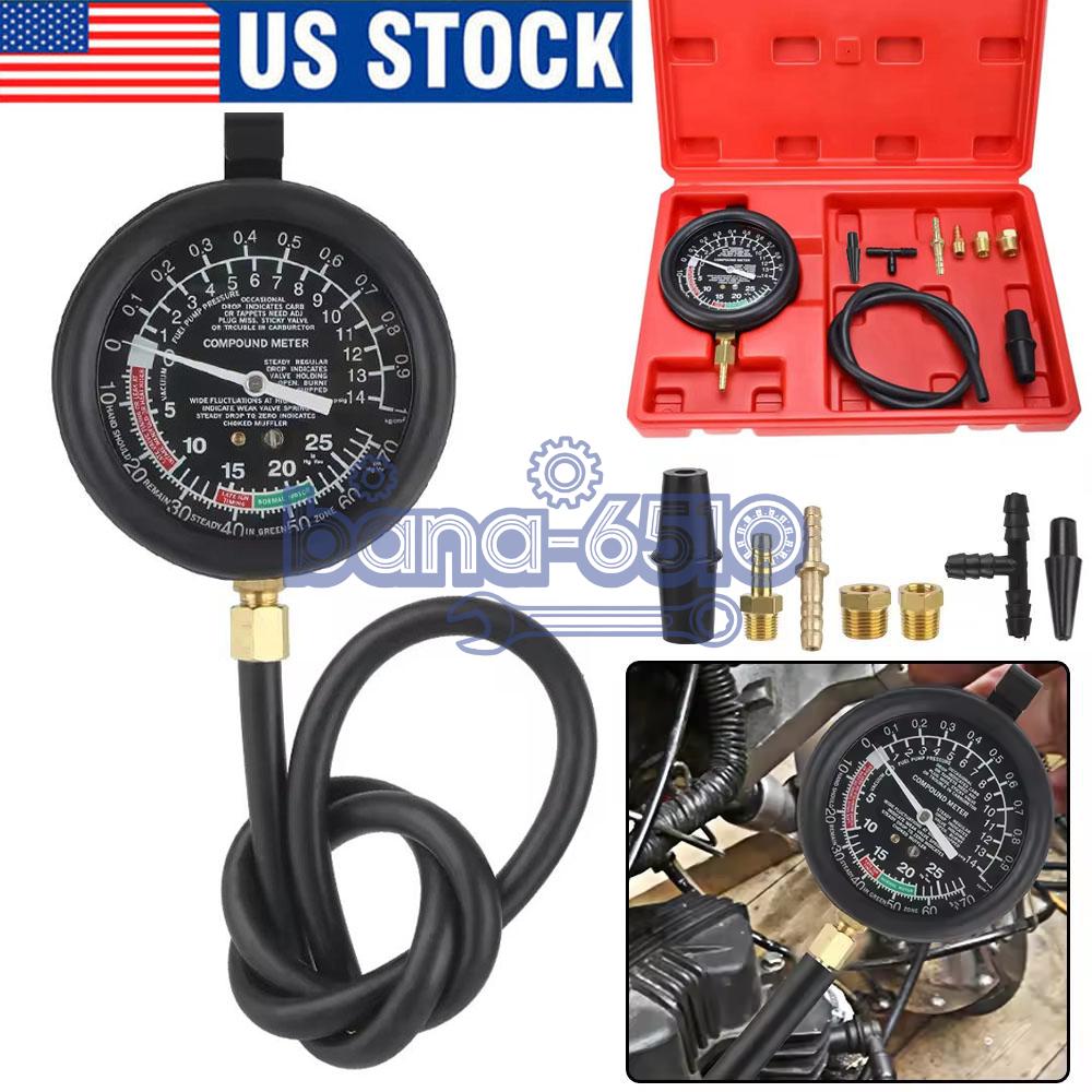 [DIAGNOSE YOUR VEHICLE] The ABN Car Vacuum and Fuel Pump Tester Gauge Kit allows you to test fuel pressure and vacuum to check for worn or defective parts in fuel pumps and vacuum systems. The kit includes various adapters for most vehicles and is designed for carburetor engines with mechanical fuel pumps operating below 10 PSI (0.7 Bar)