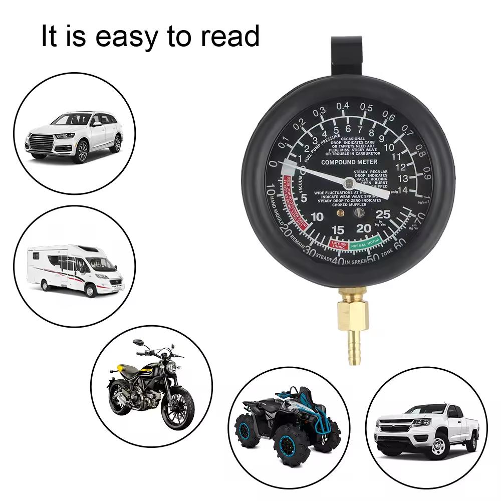 [4-IN-1 KIT] This kit allows you to test fuel pump pressure, fuel pump vacuum, carburetor intake manifold, and perform a vacuum test – Occasional Needle Drop: Indicates carb or tappet adjustment needed, missing or stuck valve, or carburetor trouble. Steady, Regular Drop: Suggests an open, burnt, or chipped valve. Wide Pressure Fluctuation at High Speeds: Points to a weak valve spring. Steady Drop to Zero Pressure: Indicates a choked muffler