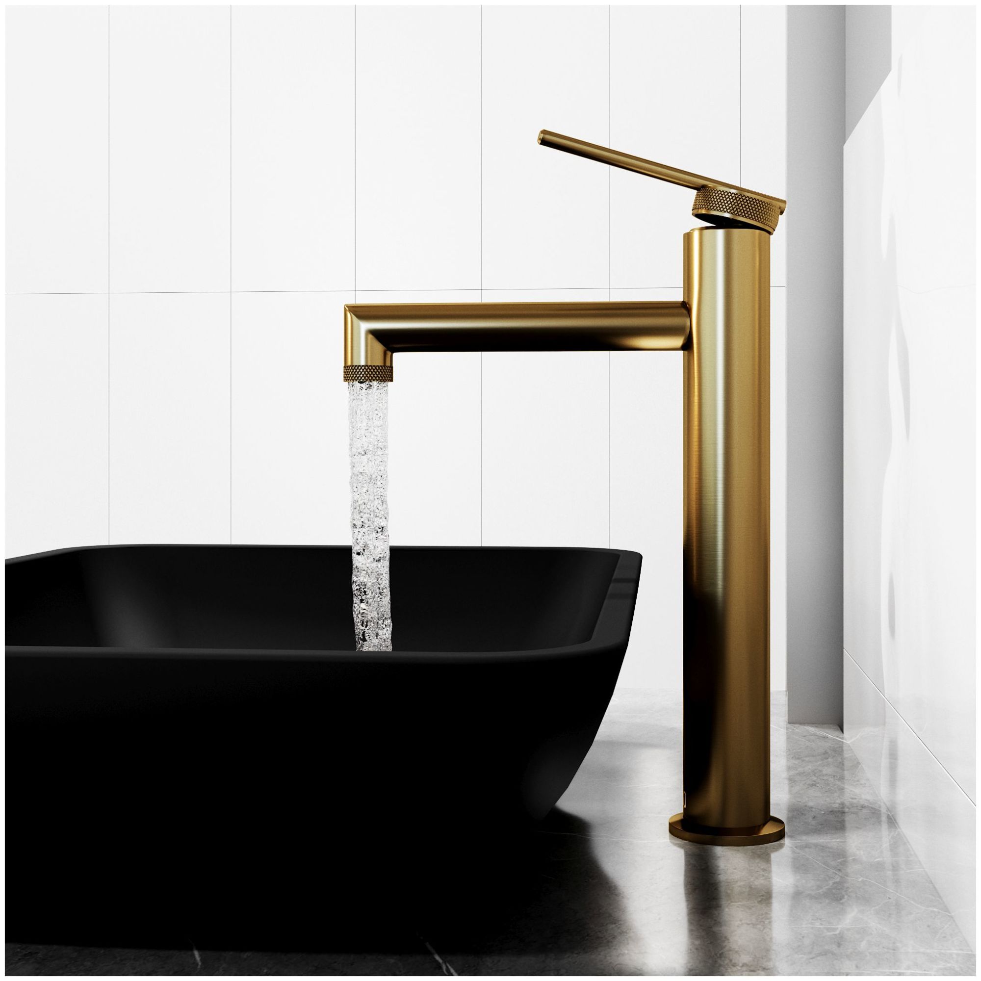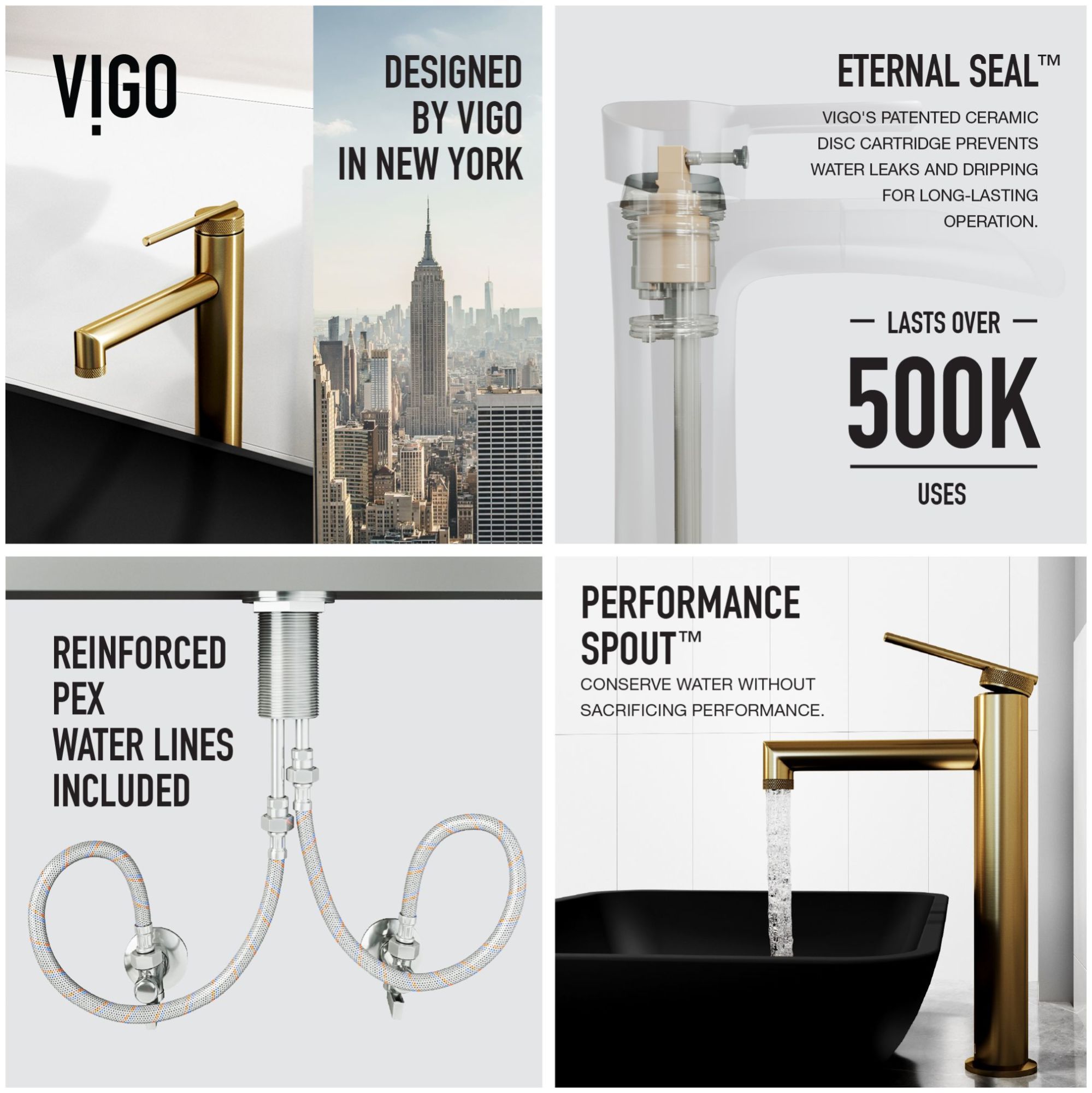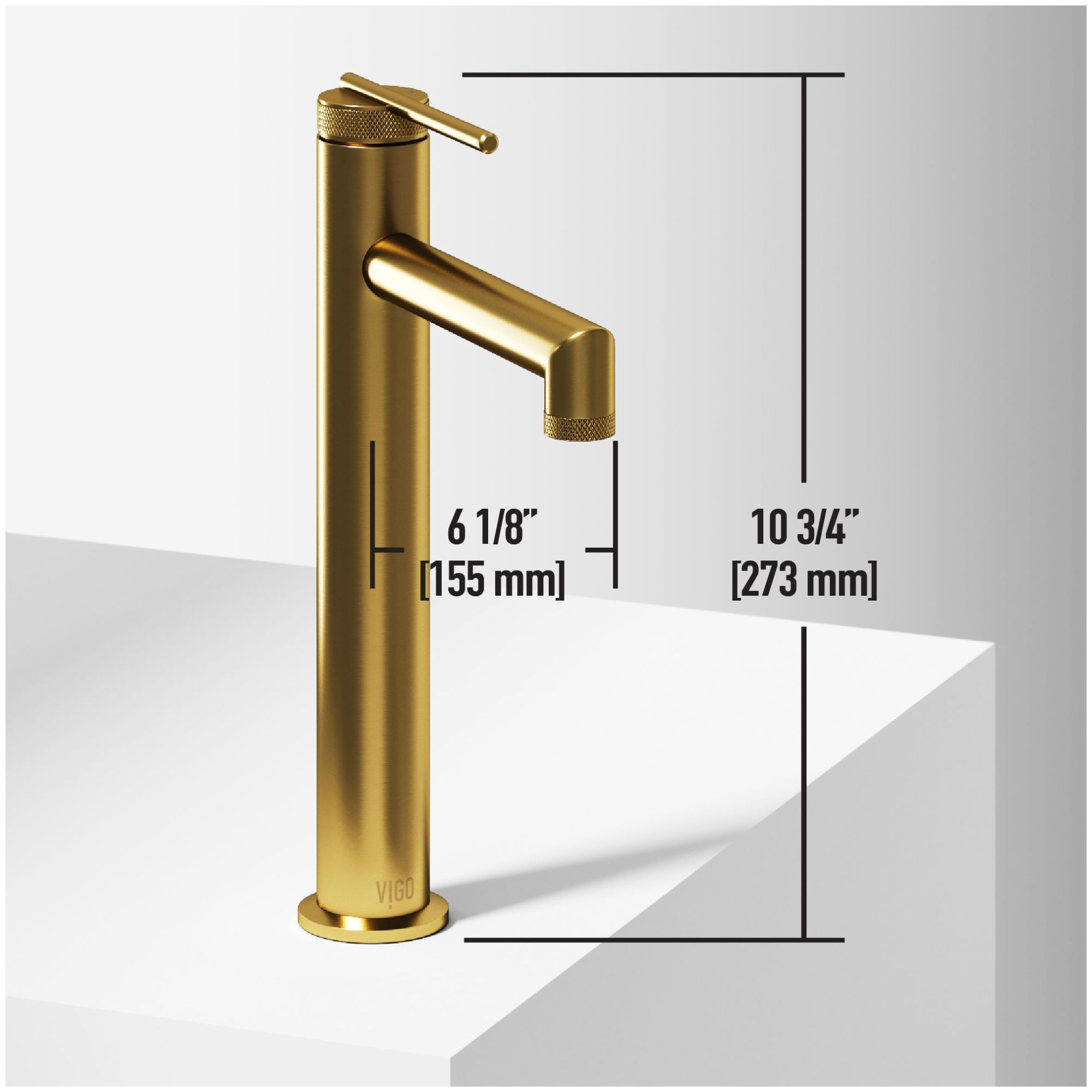 Item DescriptionA modern yet timeless design is elevated by innovative engineering to create an exceptional vessel bathroom faucet from The Sterling collection by VIGO. Taking inspiration from the elegance of jewelry and medallions, the Sterling faucet features a sleek single-handle with diamond knurling while its high arc spout provides plenty of space for hand washing. Its solid brass construction ensures long-lasting durability while VIGO’s premium 7-layer finish resists rust, tarnish and corrosion. A simple 5-step DIY installation process makes it easy for you to elevate your bath space.