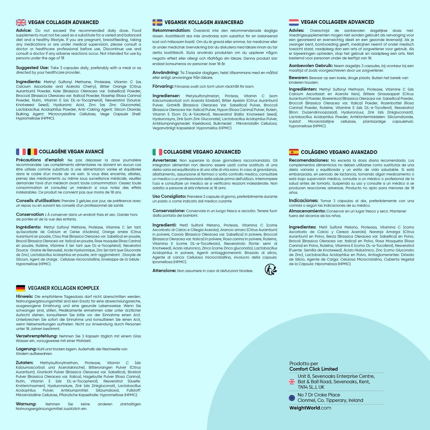 180 Capsule di Collagene Vegano - Le 180 capsule di collagene e acido ialuronico di WeightWorld sono un’alternativa ai comuni integratori collagene grazie alla formula realizzata con ingredienti di origine vegetale. Questa composizione senza derivati animali, infatti, rende l'integratore collagene adatto a chi segue regimi alimentari vegani. Inoltre, il collagene integratore WeightWorld viene prodotto in Gran Bretagna.