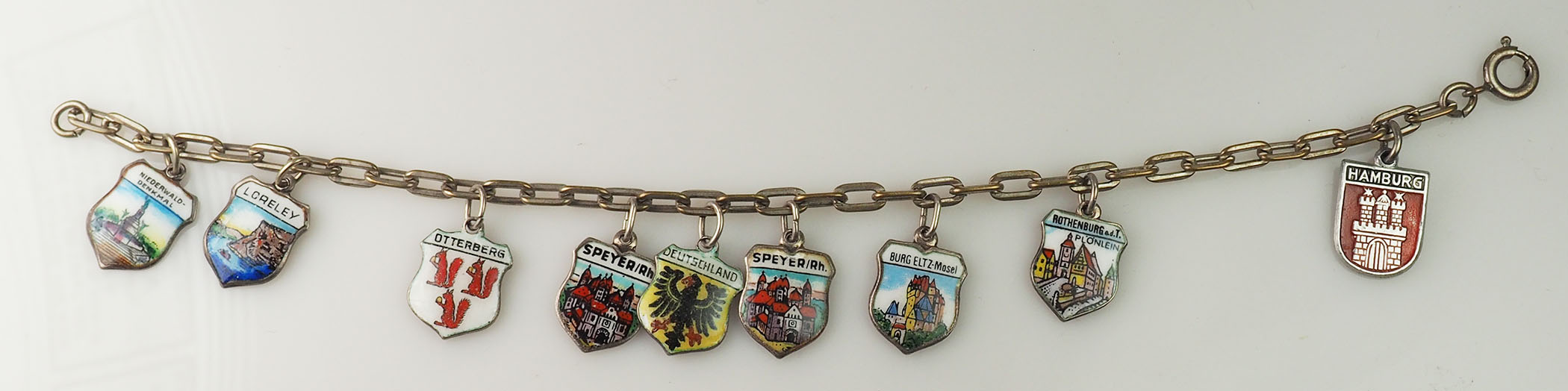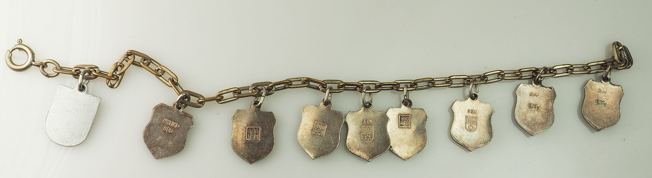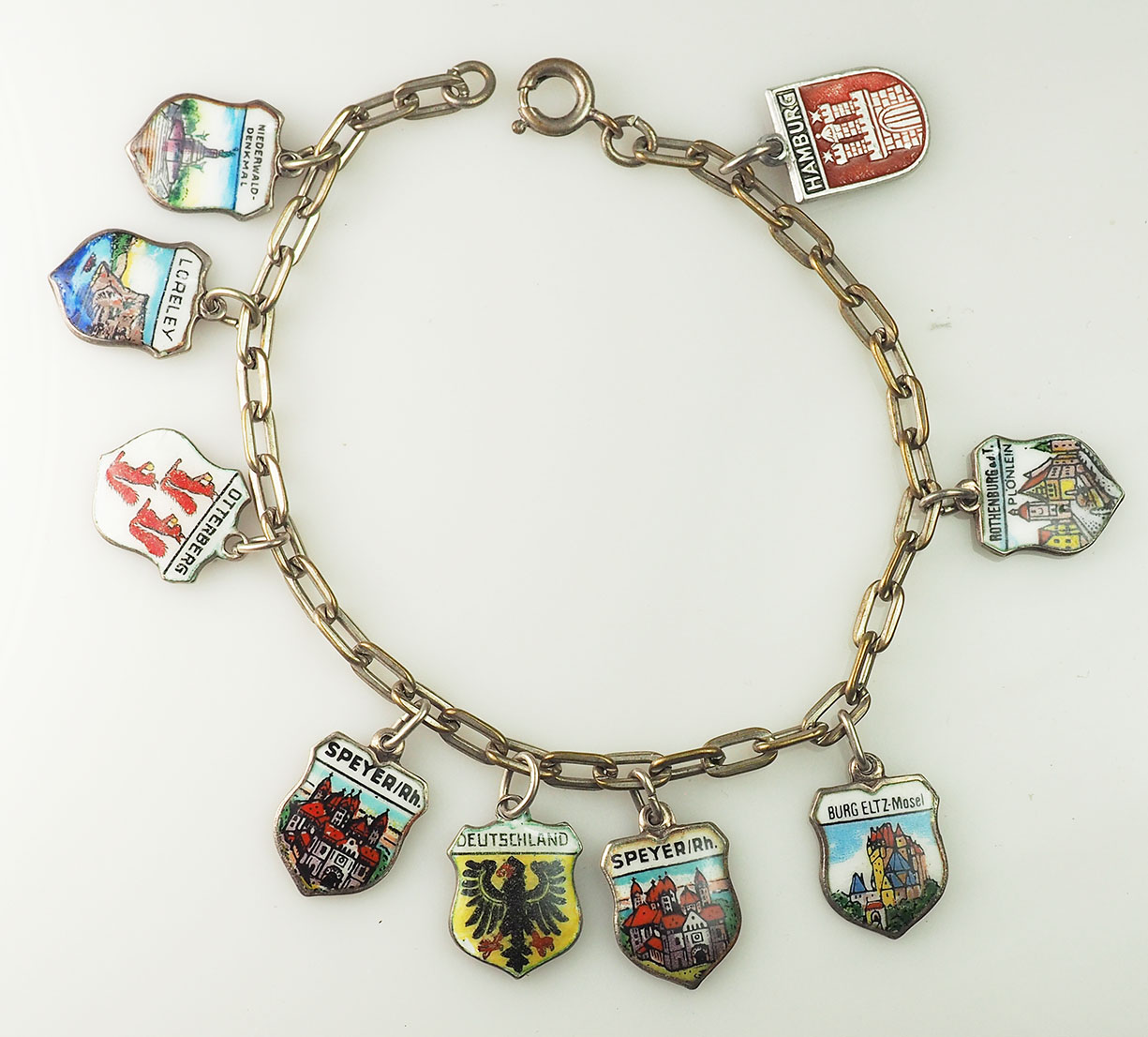 Vintage 1960s Geramny silver and enamel charm bracelets. All but one (Hamburg) charms are 800 silver, bracelet chain is nickel silver. Measures 7" when open, total weight is 12 grams. Good vintage condition.
