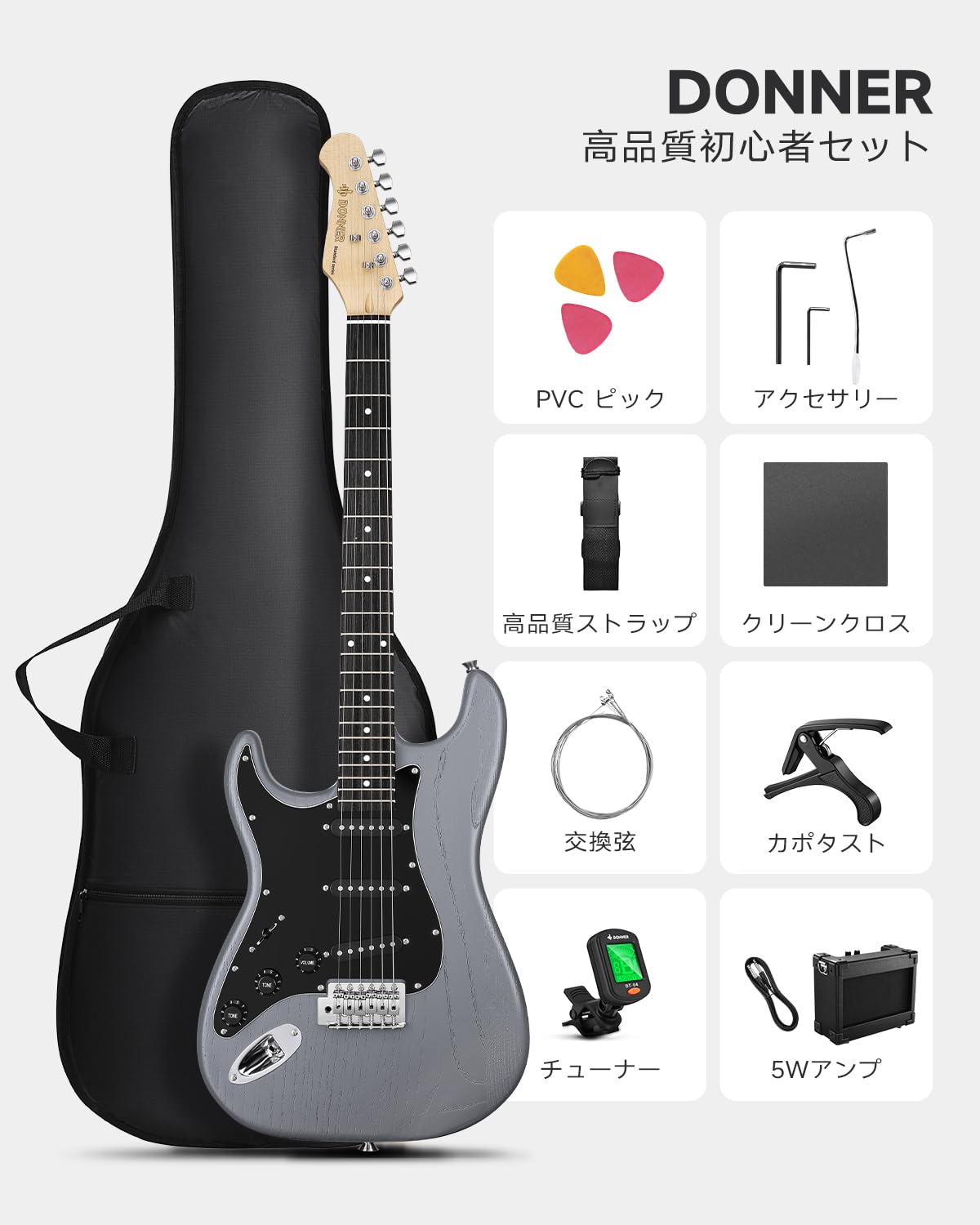 [Comprehensive Accessory Set] The Donner electric guitar package includes a 5W amplifier, premium case, capo, strap, spare strings, digital tuner, amplifier cable, picks, and more. Plus, free online lessons are included, so you can start playing right away.
