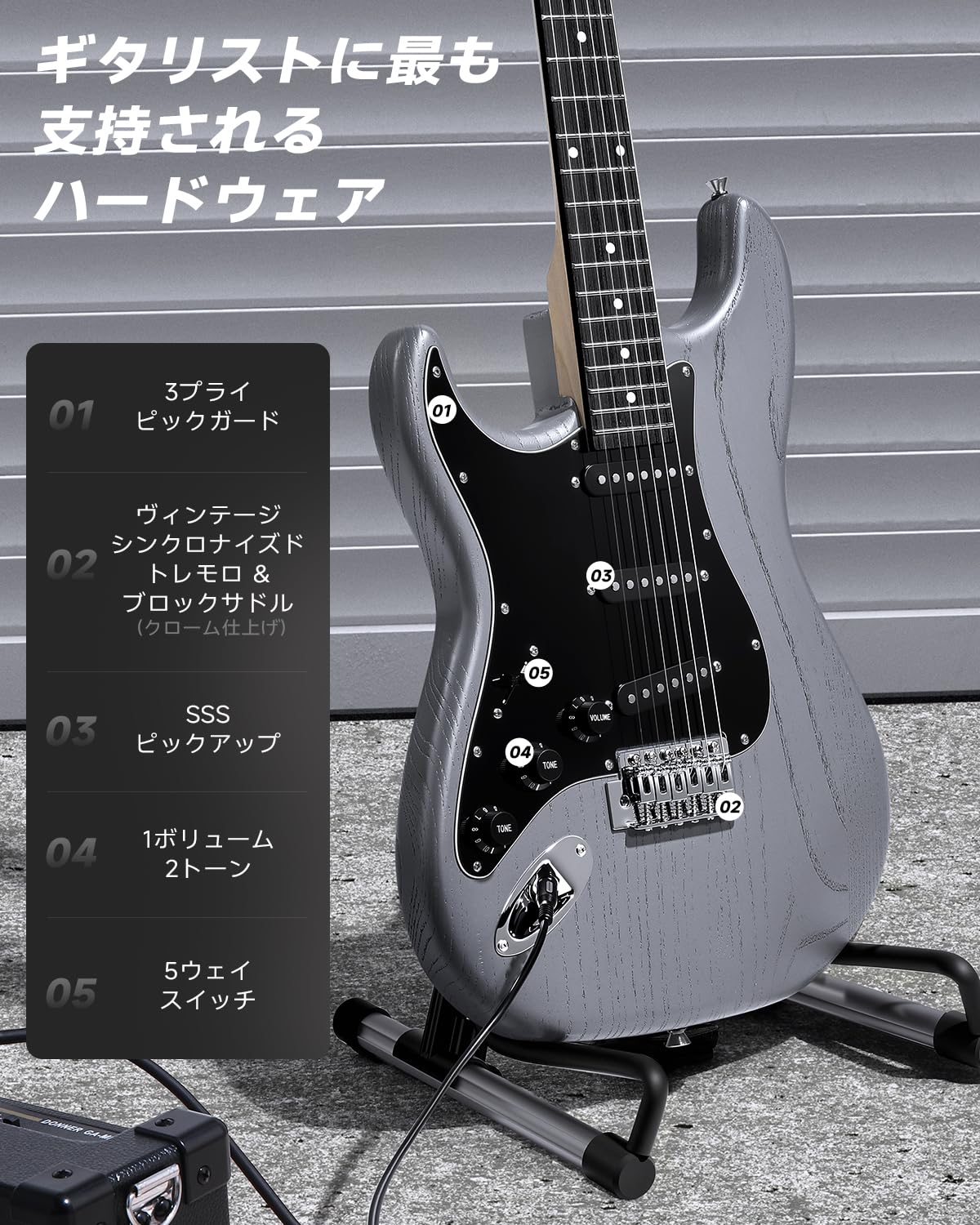 [SSS Pickup Configuration] Three single-coil pickups and a 5-way selector provide a bright, dynamic sound that is suitable for a wide range of genres.