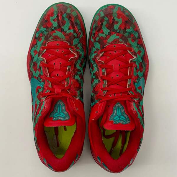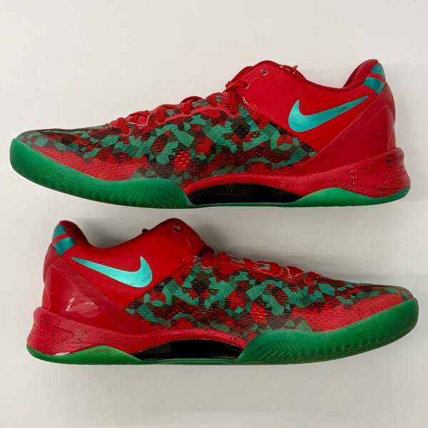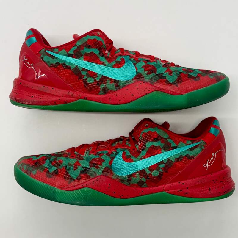 A festive Nike ID custom Kobe 8 in the iconic Grinch Christmas colorway. This pre-owned pair features the signature green and red color scheme that pays homage to the holiday classic, making it a must-have for collectors and Kobe fans alike.