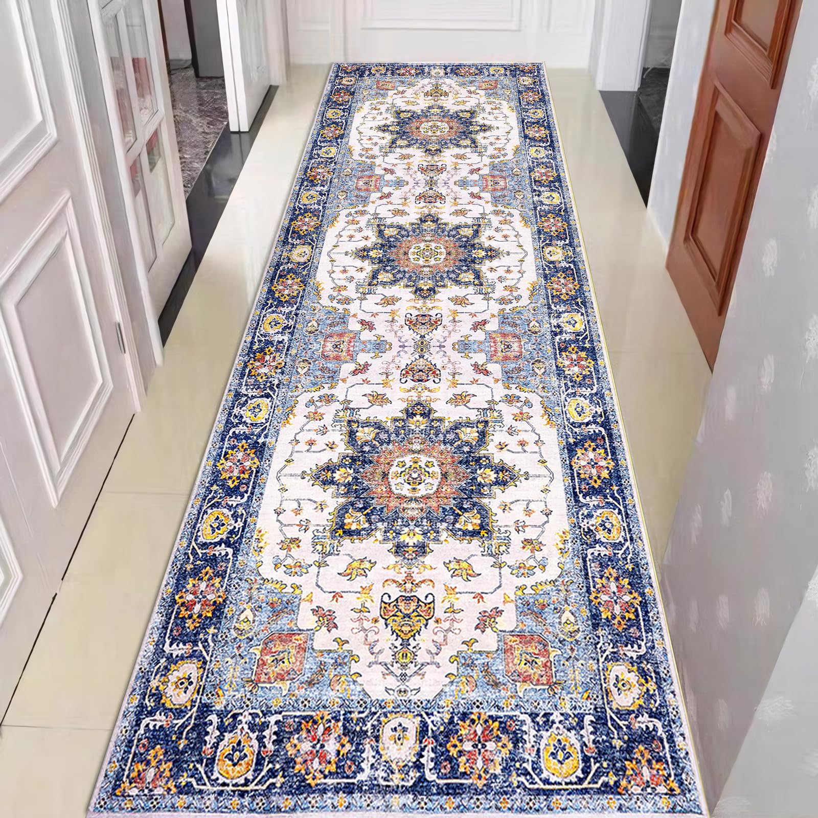 Hibate 2x8 ft (Boho Blue) Hallway Runner Rug Washable Vintage Non Slip Carpet Runners for Hallways Entryway Kitchen Laundry Room Bathroom