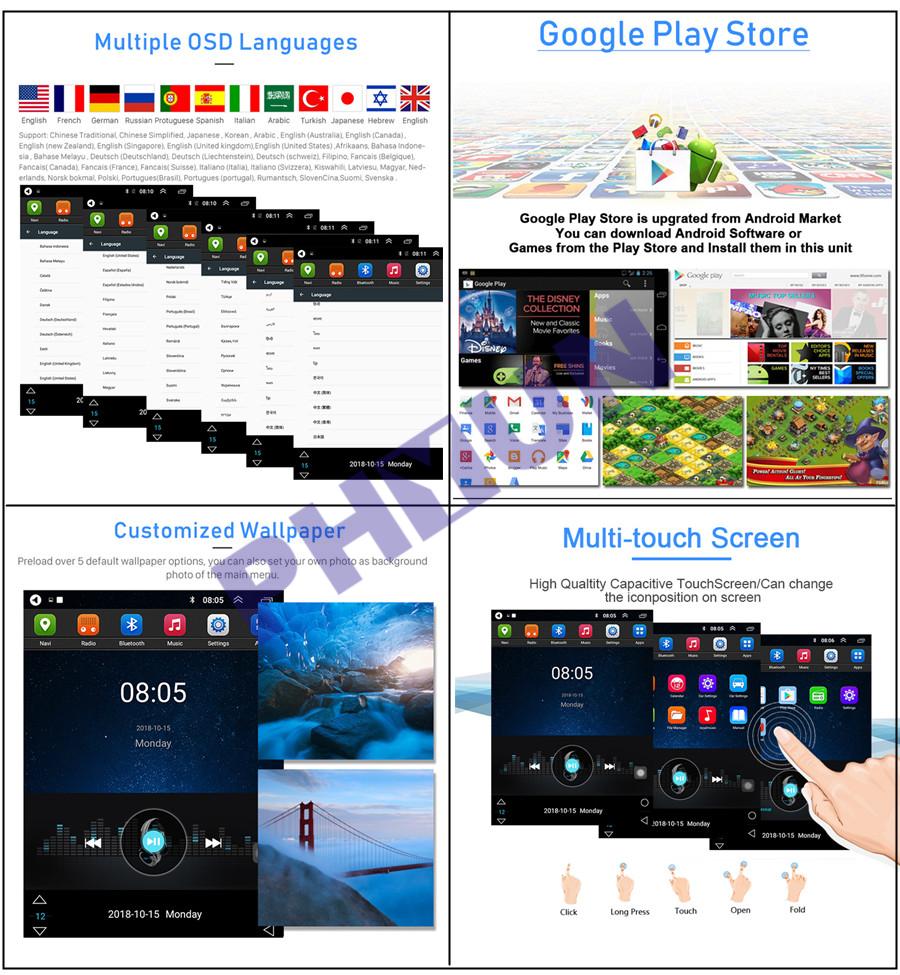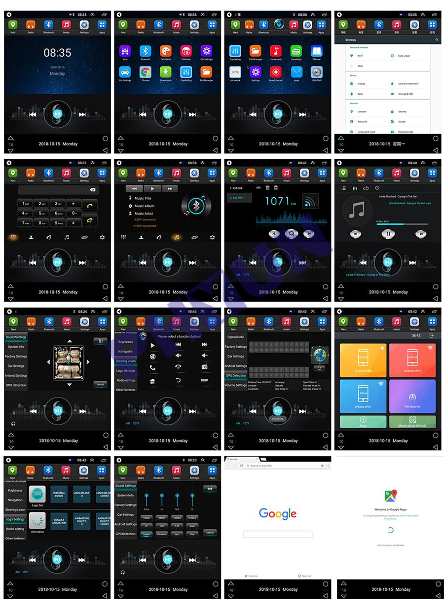 Setup | - WiFi/Hotspot/Bluetooth: Yes - Brightness level adjustable: Yes - Wallpaper: Wallpapers/Live Wallpapers/Gallery - Sound: Key Tone & Volume - Storage: Display Internal Storage/Nand Flash/Connected Device Storage - Apps: Running Apps display/force stop/uninstall - Security: Yes - Accounts: Yes - Languages and Input: more than 70 Languages and choose input method - Backup and Reset: Yes - Date and Time: Setting Date&Time by yourself or choose GPS/network-provided time - Accessibility: Yes - GPS: Yes, GPS application options/monitoring/sound mode/mixing ratio - Driving safety: Watching Video, Reversing X-mirror/Volume, Reversing Trajectory/radar Display, Rear view ruler - Amplifier: Rock/Pop/Jazz/Classic/Flat/Voice/Custom - Steering Wheel Control: Yes - About Device: Display Parameter Info. |