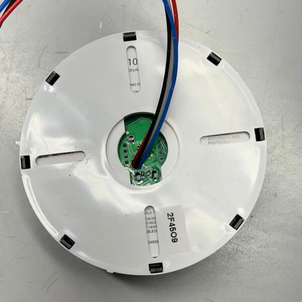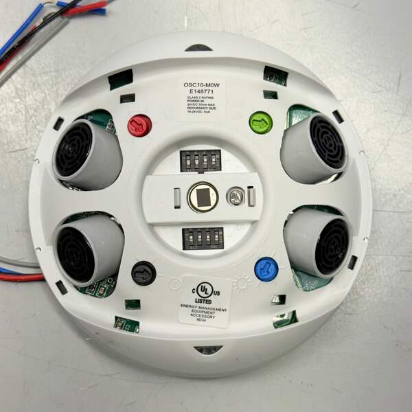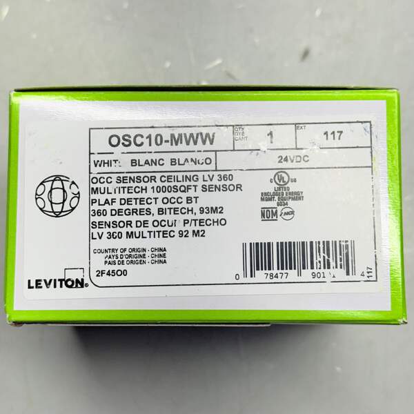 LEVITON Occupancy Sensor ,Ceiling Mount,24VDC, 1000sqft Condition: New Color: White MPN/Model: OSC10-MWW Description: Occupancy Sensor lighting control, Ceiling Mounted, Multi-technology, 24VDC, 35mA power consumption, 1000 sq ft, 360 degree (major motion: PIR: 40' diameter; U/S: 46'Lx23'W, minor motion: U/S: 34'Lx17'W), red LED=PIR, green LED-U/S, auto adapting, walk-through, time delay 30s-30m, test mode (6s time delay for 15m with auto exit), connect gray wire for photocell ambient light hold-off, 360 degree harmonic wheel (rotatable), mounting height 8'-10', cUL/NOM listed, CEC Title 24 compliant Color: white.