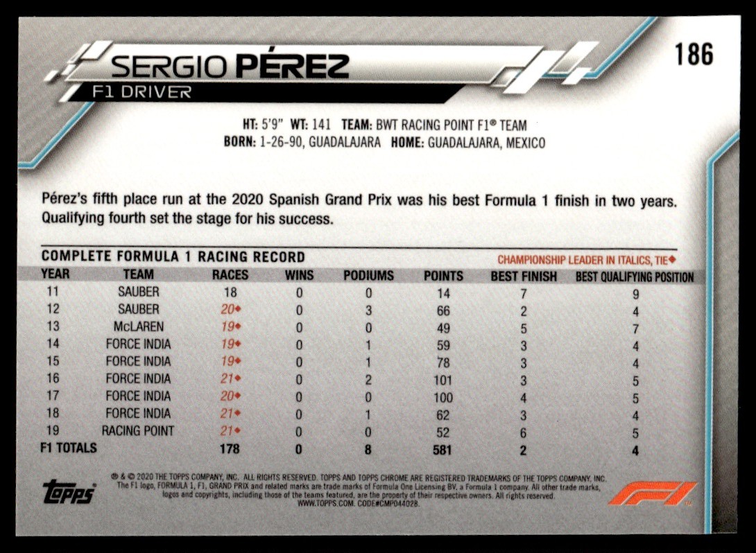 | 2020 Topps Chrome Formula 1 Sergio Pérez BWT Racing Point F1 #186 |