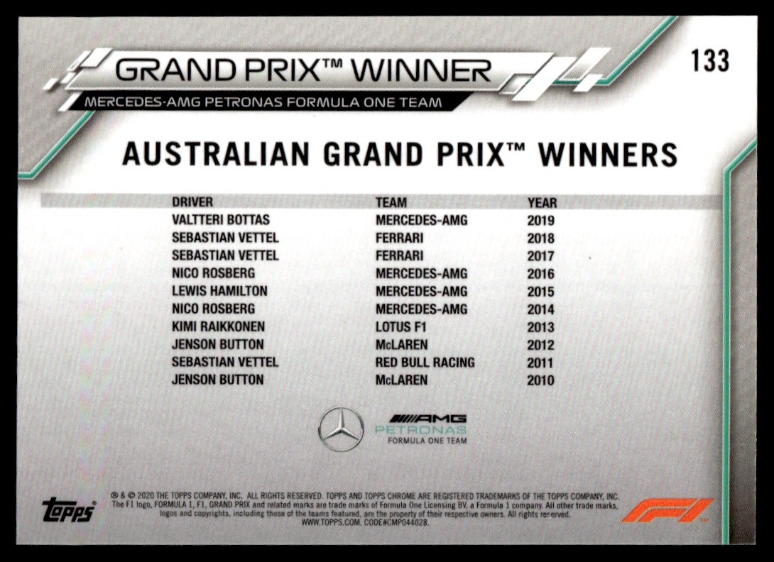 | 2020 Topps Chrome Formula 1 Valtteri Bottas Mercedes-AMG Petronas F1 #133 |