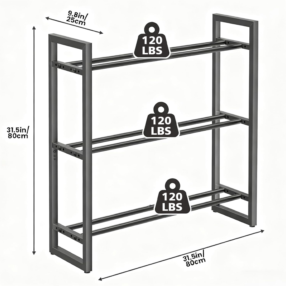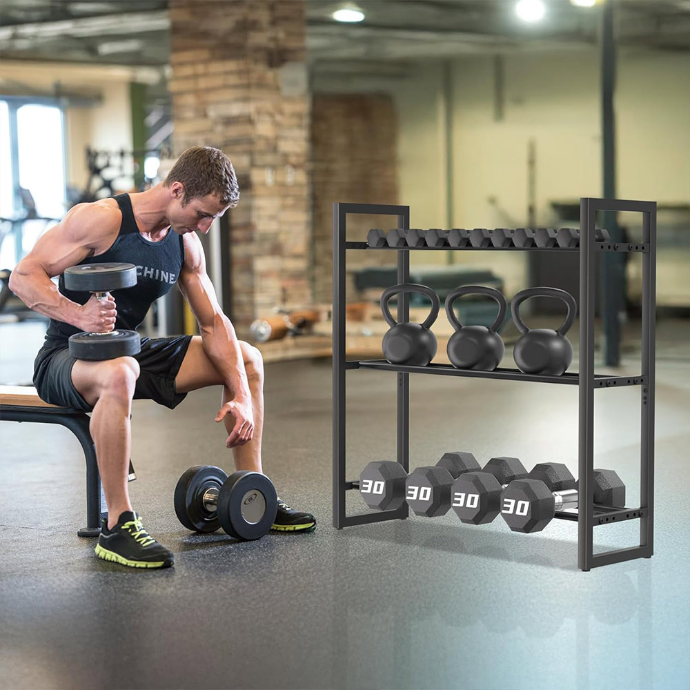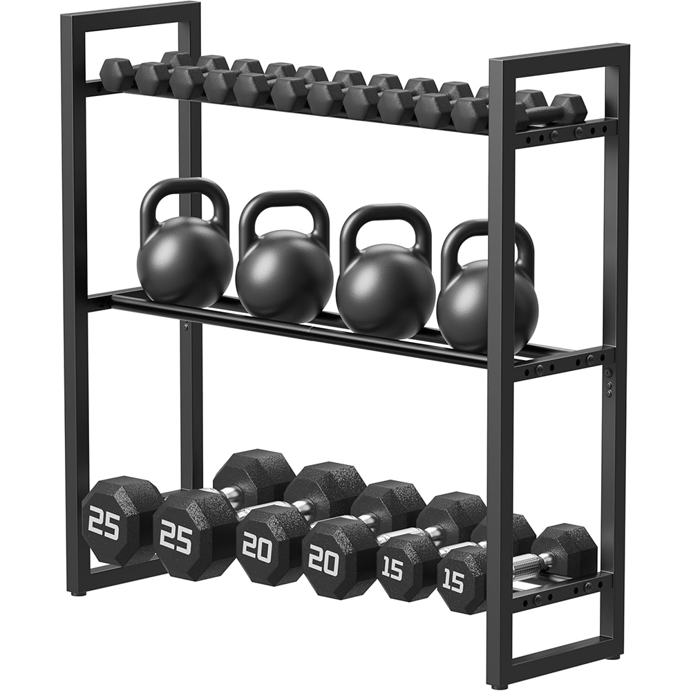 Durable & Stable Construction – Made from reinforced metal with a powder-coated finish, this rack is built for long-term use. Each shelf supports up to 120 lb, with a total weight capacity of 360 lb, providing a strong and reliable storage solution for home and gym environments
