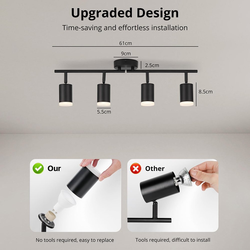 Replaceable GU10 bulb: Lamp head size: 85mm*55mm. Black ceiling lamps can be matched with different types of GU10 bulbs according to different scenarios, such as single-color bulbs, dimmable bulbs and smart bulbs. You can choose the appropriate light source according to your personal needs to achieve the ideal lighting effect.