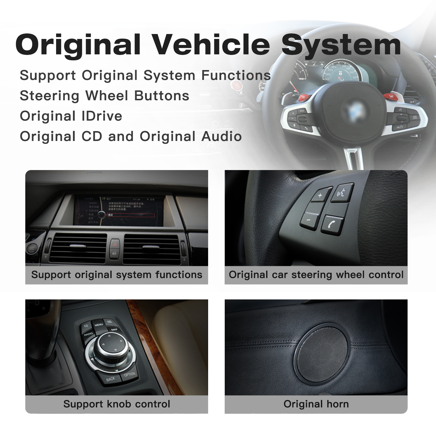 There are various systems available for BMW cars. Please confirm whether your original car system is CCC/CIC/NBT/EVO before purchasing, as other systems are not compatible and cannot be used. If you are unsure which system your car has, you can check your existing dashboard with the home menu on the screen, your car's VIN, and the LVDS port behind the current screen. We will check it for you.