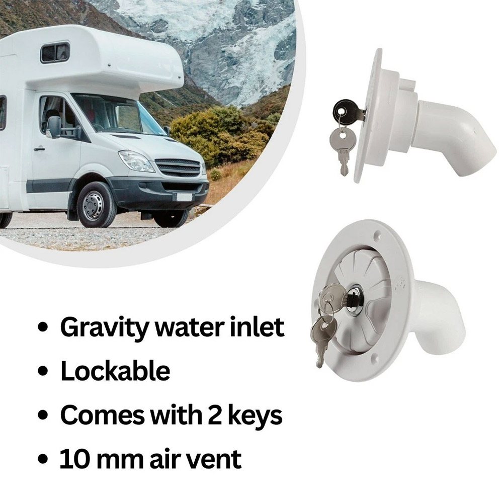 Constructed from premium-grade, weather-resistant materials, this set is built to withstand the toughest outdoor conditions. Whether it's rain, sunshine, or even a dusty trail, our Water Inlet Filler and Locking Cap will keep your water supply safe and secure. Our filler cap features rubber seal to avoid any leak and a 10mm air vent for smooth filling. Easilly refill your on-board water tank on most motorhomes, campervans or caravans.