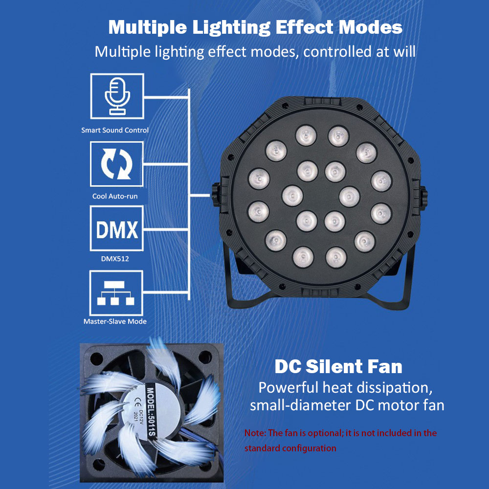 【Multiple Working Modes and Lighting Effect】The DJ lights is with 7 modes: Static color / Strobe / Fading / Automatic / Sound Activated / Master-slave / DMX modes.You can choose and control with the wireless remote.The remote can control both par lights at the same time