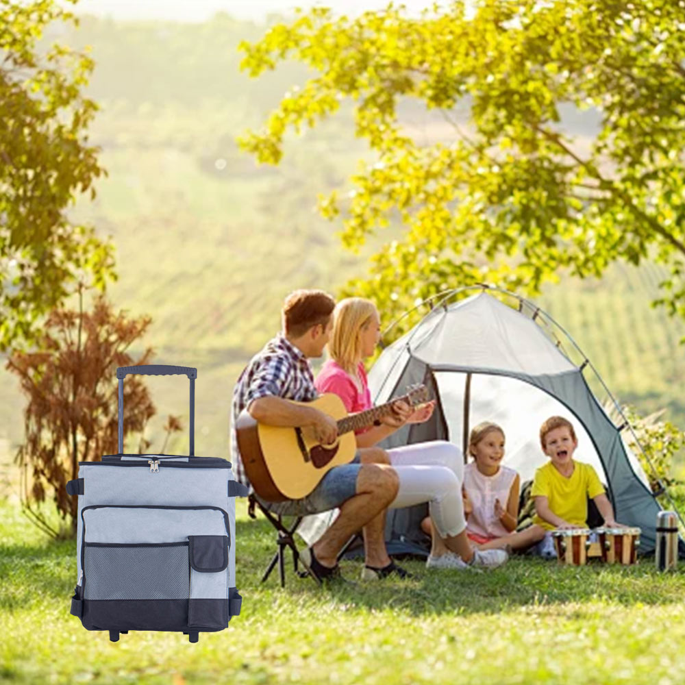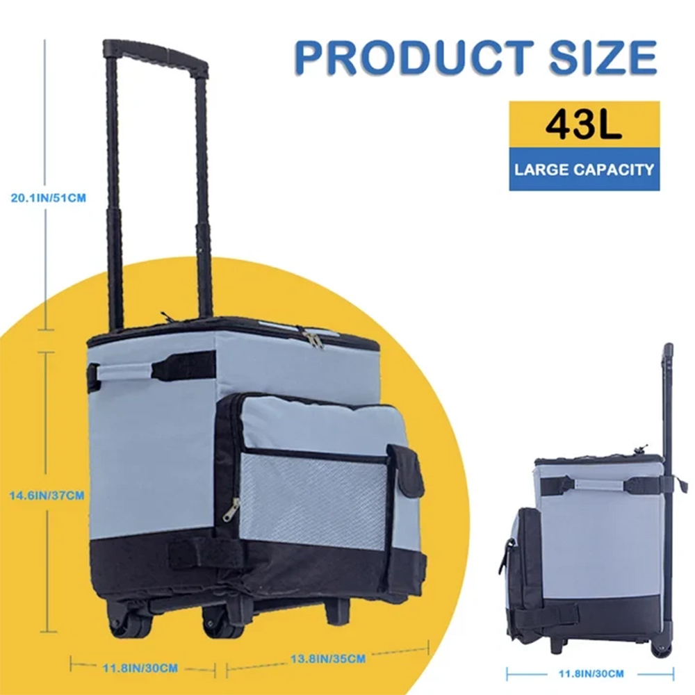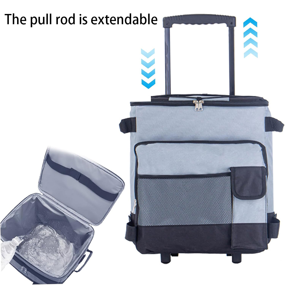 This rolling cooler is a fully insulated leak-proof cooler which can carry anything such as sodas, beer, wine bottles ,sandwiches, chips and other snacks. The front zipper pocket and mesh pockets offer additional storage space, storing keys, phone and wallet and other personal items. And the top elastic rope is for holding picnic mat. Perfect for keeping food and beverages cold during travel, Barbecues, pool parties, picnics, and more. This thermal bag is not only suitable for summer but also can maintain the temperature in winter