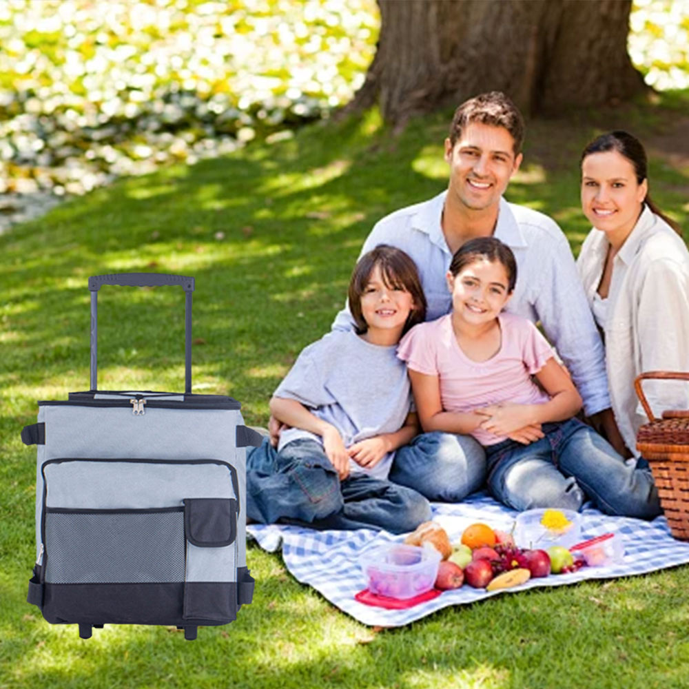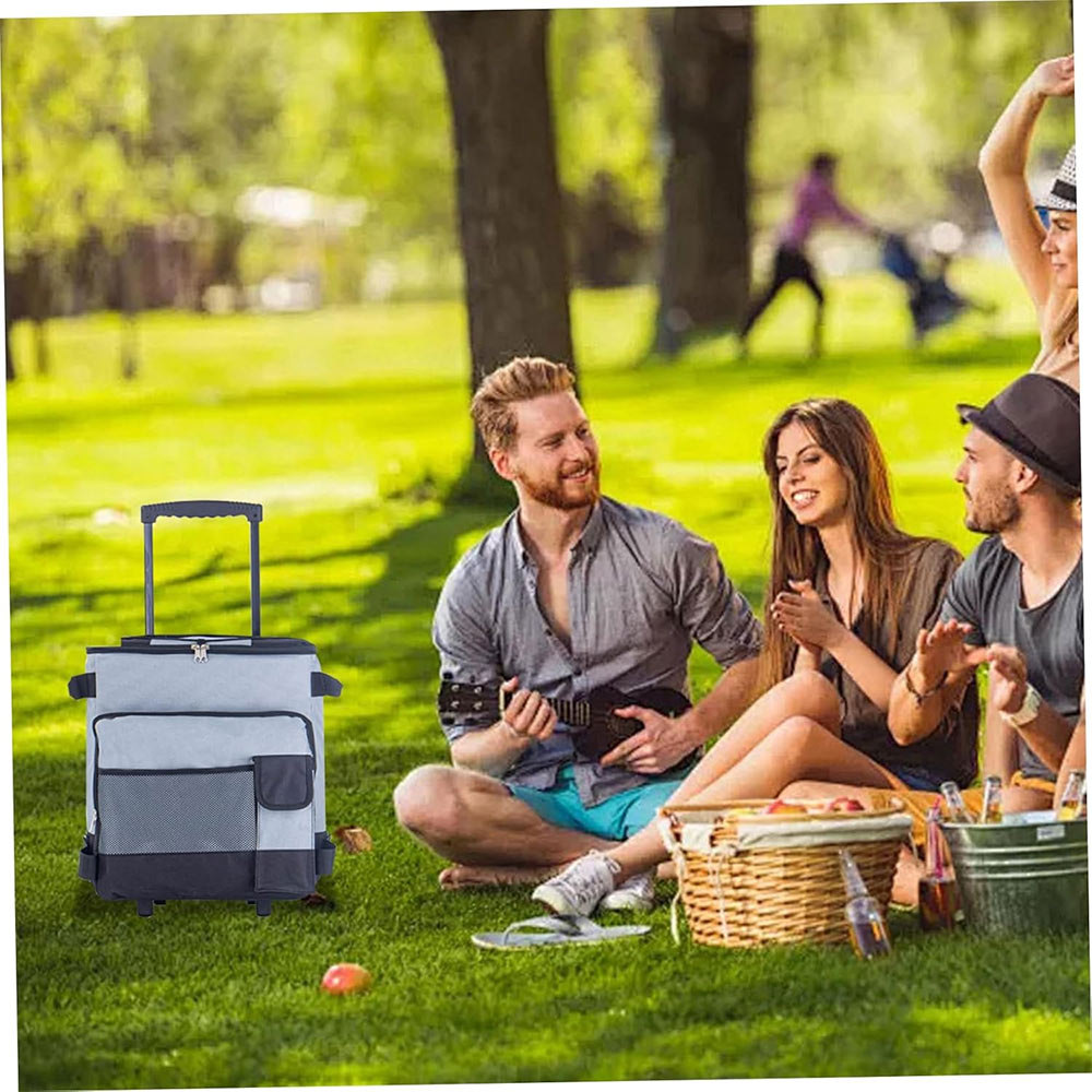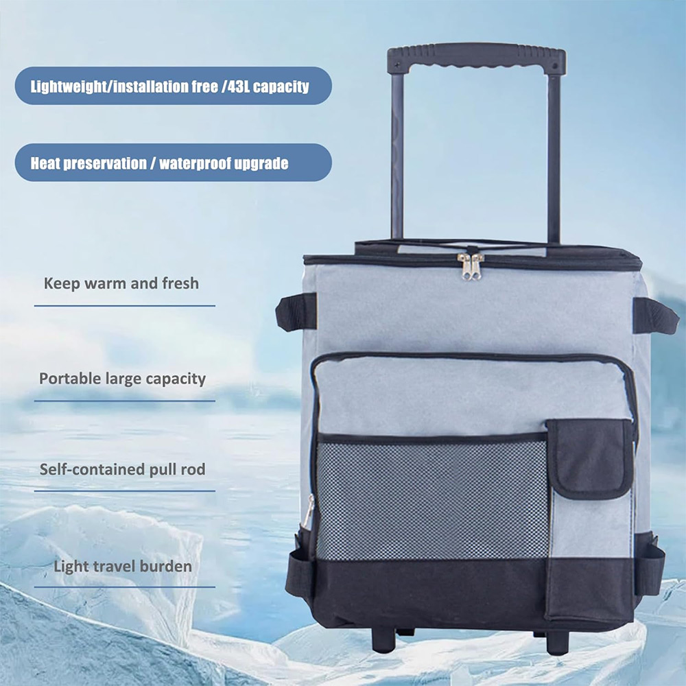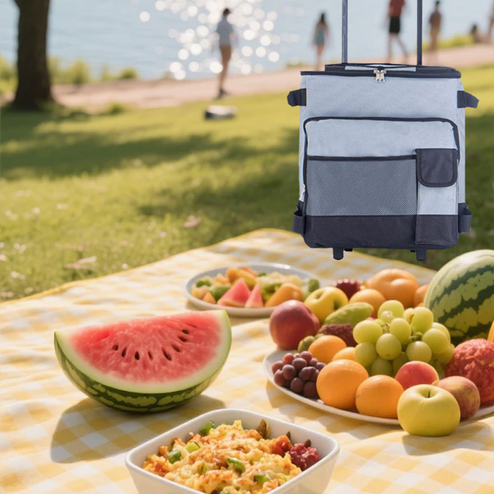This rolling cooler is a fully insulated leak-proof cooler which can carry anything such as sodas, beer, wine bottles ,sandwiches, chips and other snacks. The front zipper pocket and mesh pockets offer additional storage space, storing keys, phone and wallet and other personal items. And the top elastic rope is for holding picnic mat. Perfect for keeping food and beverages cold during travel, Barbecues, pool parties, picnics, and more. This thermal bag is not only suitable for summer but also can maintain the temperature in winter