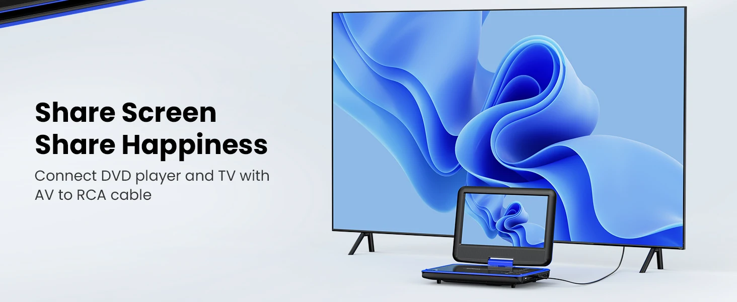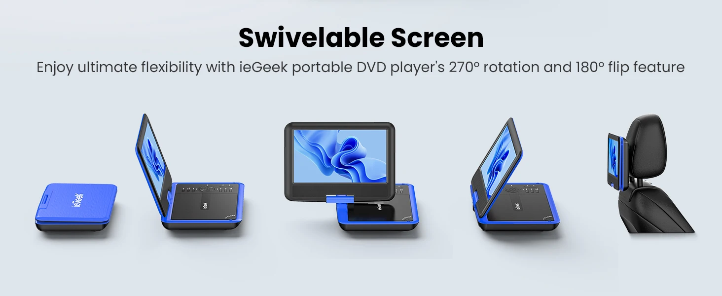 👨👩👧 Portable and Magical ---- Compact design makes it easy to carry out with you. Take it on your road trip, be companioned by your child, brings tons of fun for your journey. ieGeek DVD player can be easily swiveled as a tablet and mounted to the car headrest.