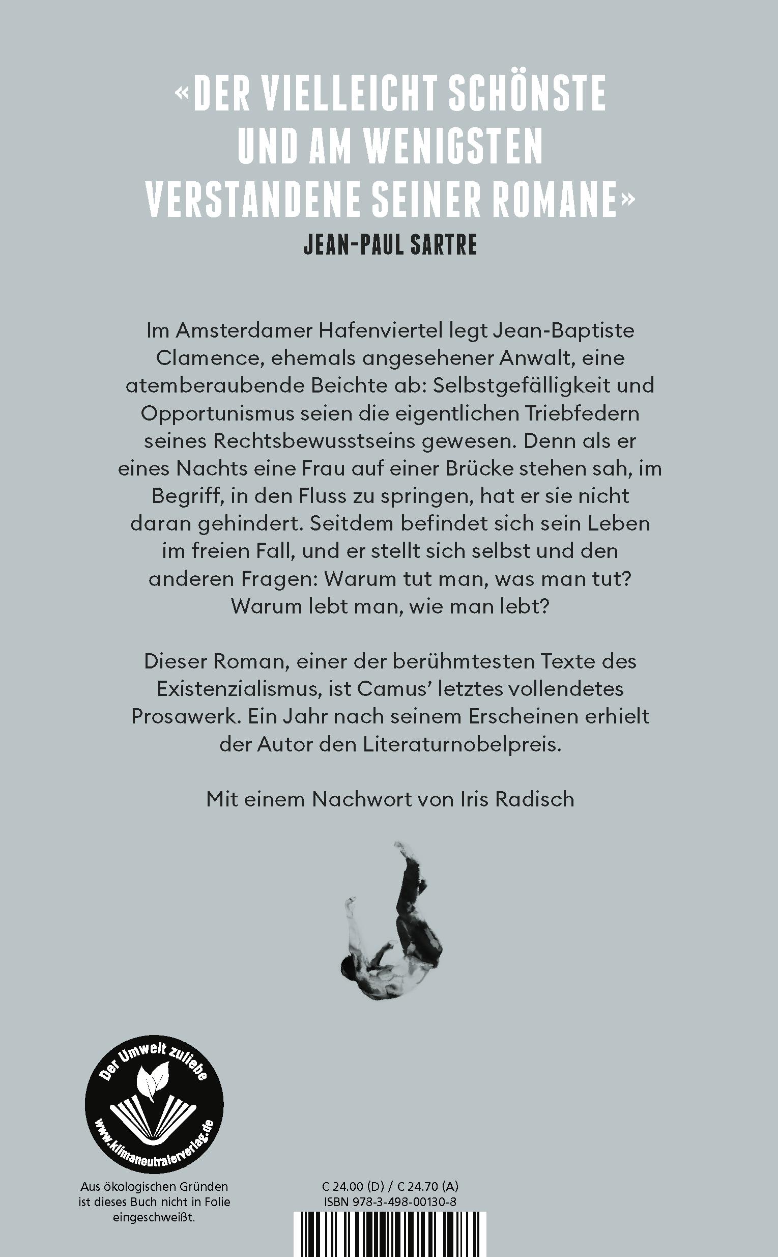 Frankreich / Roman, Erzählung, Humor Amsterdam / Roman, Erzählung Amsterdam Bewusstsein Der Fremde Die Pest Existenialismus Fjodor Dostojewski Freiheit Friedich Nietzsche Hochstapler Jean-Paul Sartre Klassiker La Chute Lebensbeichte Literatur Literaturnobelpreis Literaturnobelpreisträger Monolog Moral Moralapostel Neuübersetzung Nobelpreis für Literatur Nobelpreisträger Literatur Philosophie Richter Roman Simone de Beauvoir Sinn des Lebens Sinnfrage Sinnlosigkeit des Lebens Sündenfall Weltliteratur französische Bücher französische Literatur französischer Klassiker