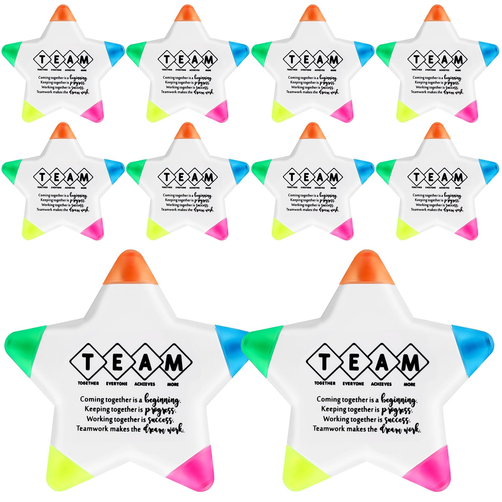 - Motivational Star Highlighter Set: includes 10 star-shaped highlighters in 5 vibrant fluorescent colors, perfect for brightening important notes; Each highlighter is designed with motivational team quotes, inspiring positivity and encouragement, making them ideal gifts for team members or students