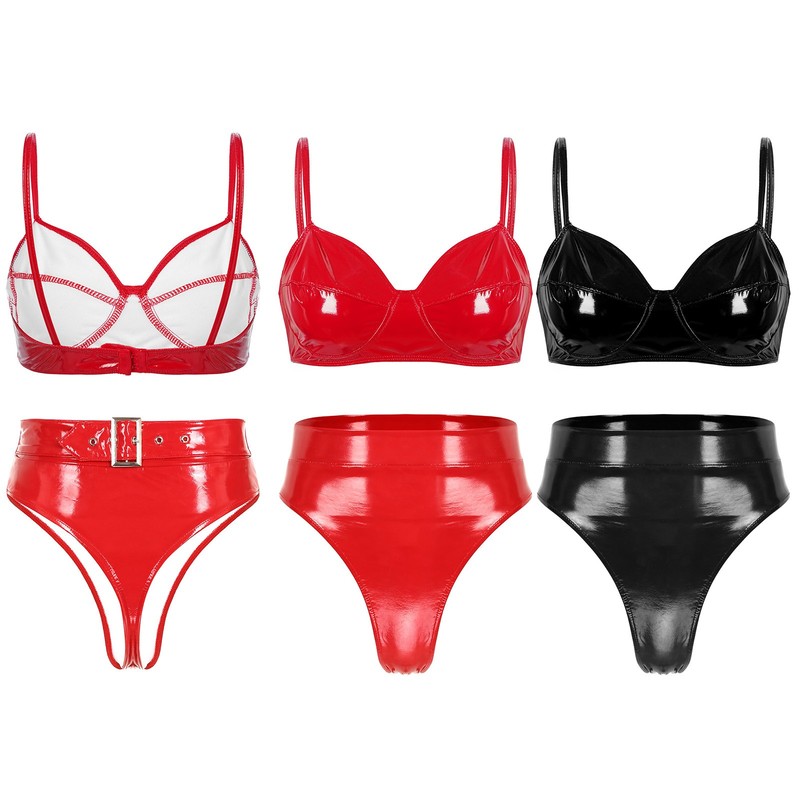 Women’s Lingerie Wet Look Bra Top with Briefs for Club.