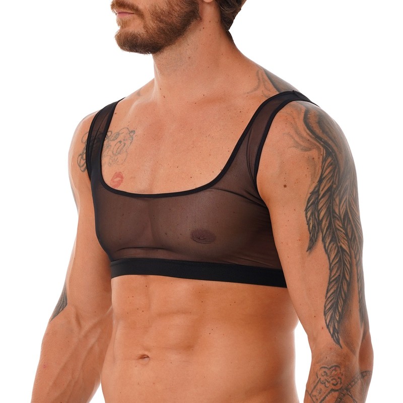 Sleeveless and u neckline, slim fit and see through design, pull on closure.