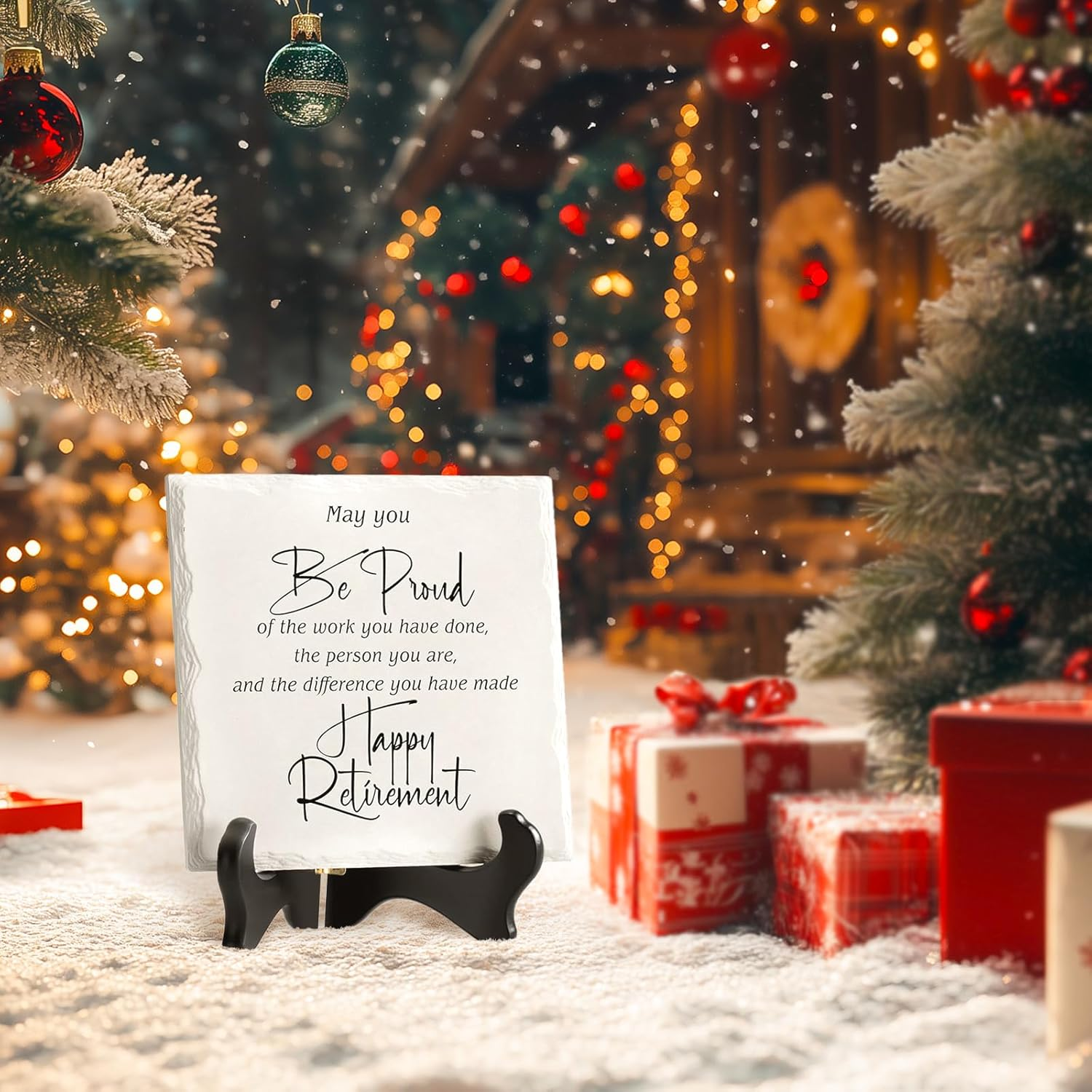 - â¤ãHappy Retirement Decorationã The 6"x6" square ceramic tile with natural-looking broken edges, the touching message is specially printed on a ceramic tile, it will mix in well with any décor. A tasteful addition to tables, shelves, bedroom nightstands, and so on.