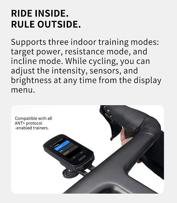Supports three indoor training modes: target power, resistance mode, and incline mode. While cycling, you can adjust the intensity, sensors, and brightness at any time from the display menu.