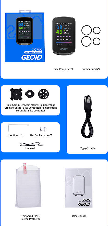 Type-C Cable; Tempered Glass Screen Protector; User Manual; Lanyard; Bike Computer Stem Mount; Replacement Stem Mount for Bike Computer; Replacement Mount for Bike Computer; Rubber Bands*4;Bike Computer*1;Hex Socket screw*2;Hex Wrench*1