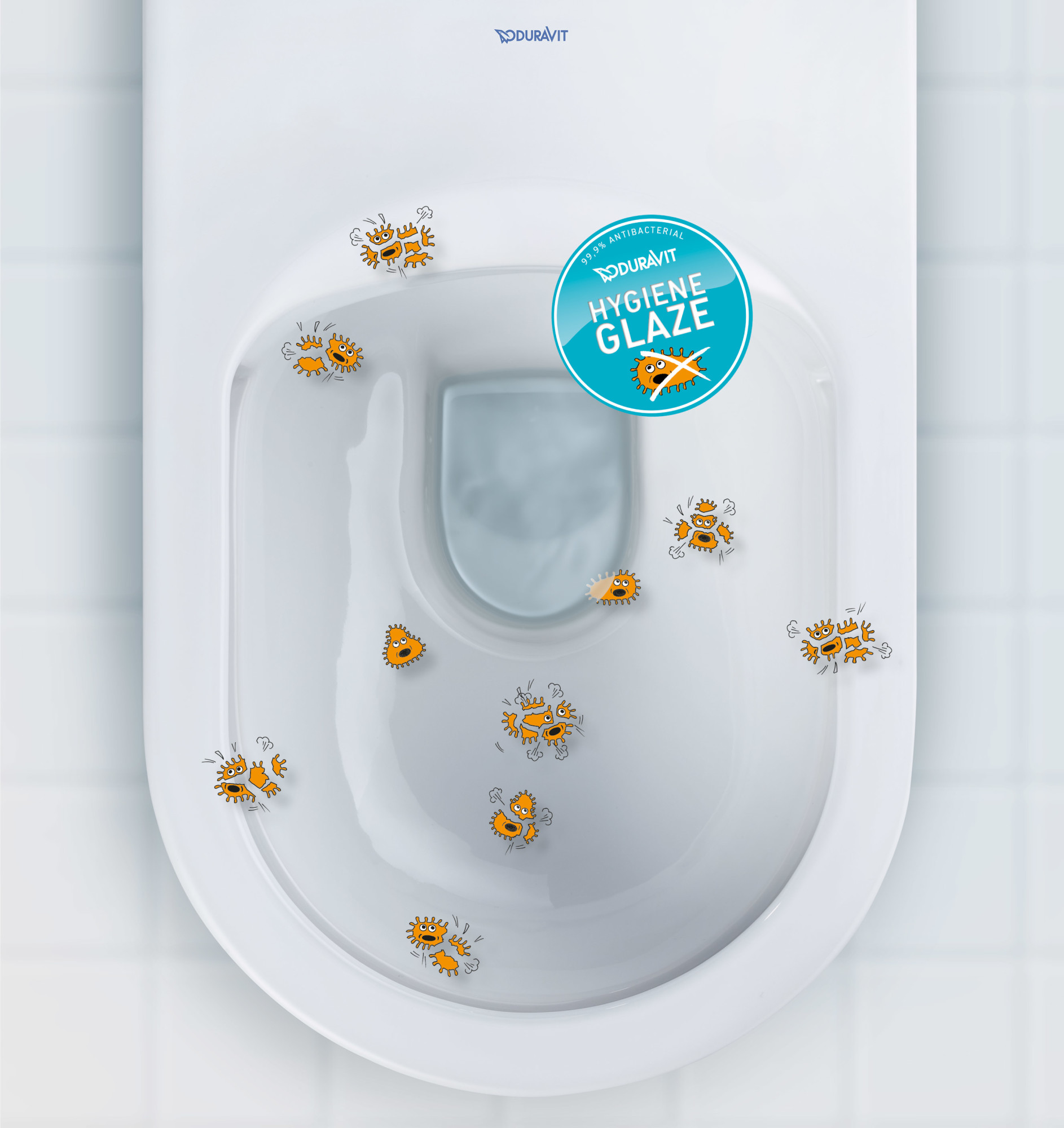 - HygieneGlaze: Duravit defines its new standard in bathroom hygiene with its antibacterial, durable and safe technology, HygieneGlaze. The innovative ceramic glaze is antibacterial which effectively kills bacteria and germs. HygieneGlaze is not a surface coating. It is integrated into the ceramic glaze and then baked into the ceramic during firing, providing continuous protection with long-lasting effectiveness.