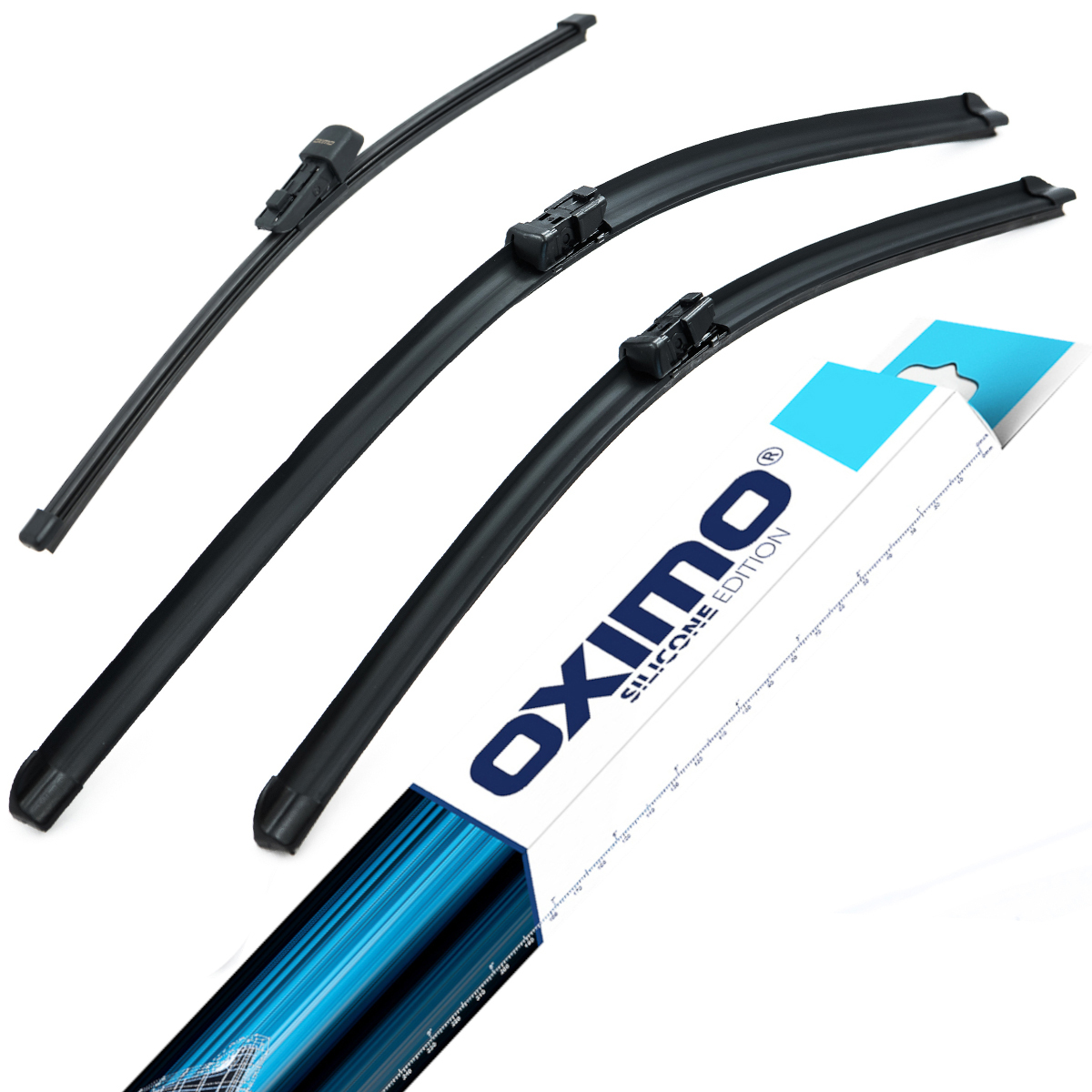 Das OXIMO Scheibenwischer-Set besteht aus drei exakt angepassten Wischern – für Front- und Heckscheibe. Sowohl die Front- als auch der Heckscheibenwischer verfügen über eine moderne, rahmenlose Konstruktion (Flachwischer), die eine optimale Anpassung an die Scheibenkrümmung gewährleistet. Dies sorgt für ein besonders gleichmäßiges, leises und streifenfreies Wischergebnis bei allen Wetterbedingungen.