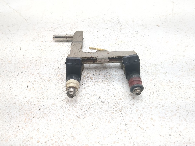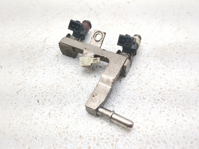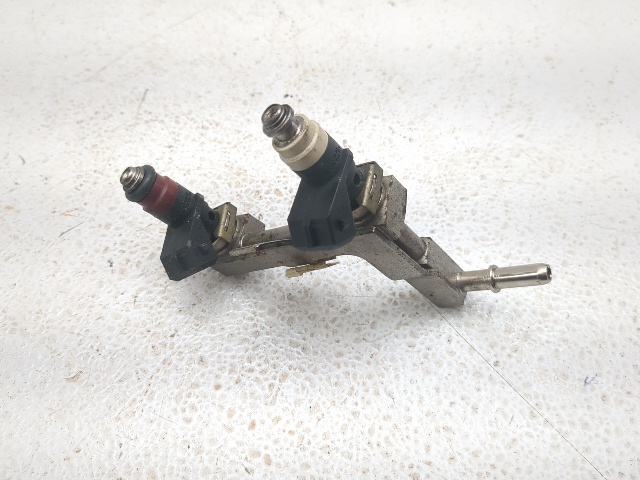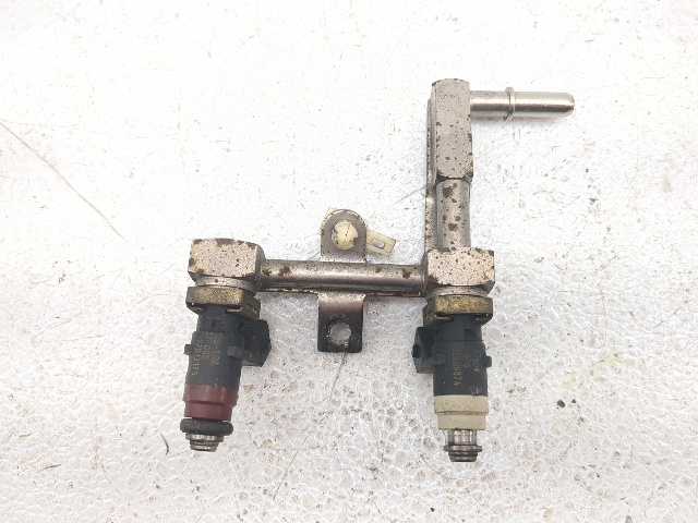 Fuel Rail - Complete fuel delivery assembly including the metal fuel rail and two fuel injectors (one red band, one white band). Fits 2004-2007 Buell XB9 and XB12 models including Lightning, Firebolt, and Ulysses. Structurally sound with age-appropriate surface oxidation on the rail. OEM P0013.1AA (Rail), 27609-01S (Injectors).