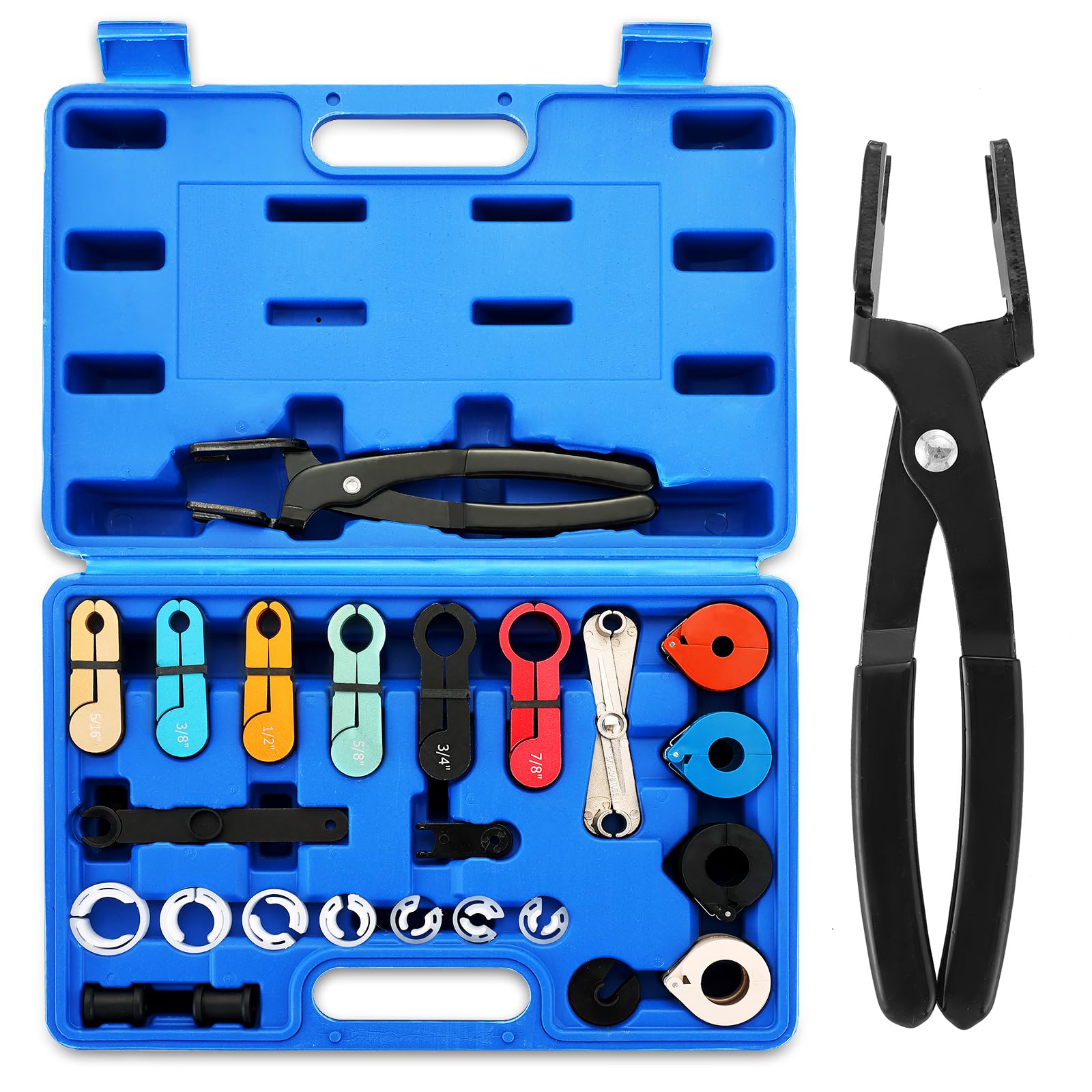 Color-Coded Designs: Each tool is color-coded and size-marked for quick identification, making repairs more efficient and user-friendly - including 1/4", 5/16", 3/8", 1/2", 5/8", 3/4", and 7/8". The fuel line disconnect tool set also available to meet the special requirements of newer GM trucks, Ford vehicles equipped with automatic transmissions, and special pipes in 4.0L V6 Rangers and Explorers.