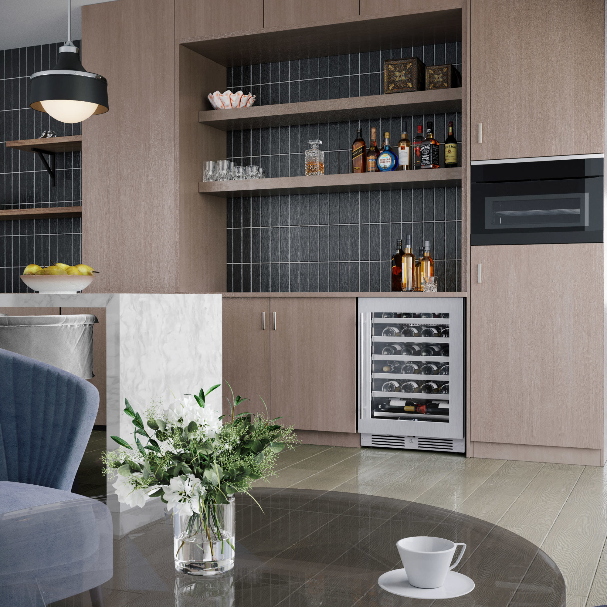 - Zero-clearance door hinges allow for a seamless installation with adjacent cabinetry