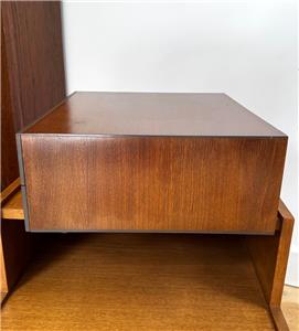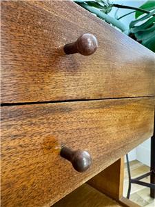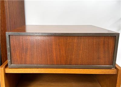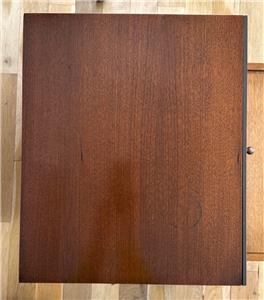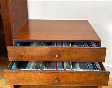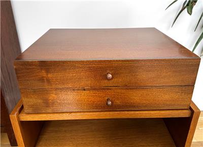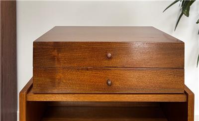 Authentic mid-century modern tabletop case goods attributed to Paul McCobb. Compact all original two-drawer design with turned wood pulls. One of two matching chests listed separately. Uses; jewelry box, valet, desk organizer, or small accent storage.