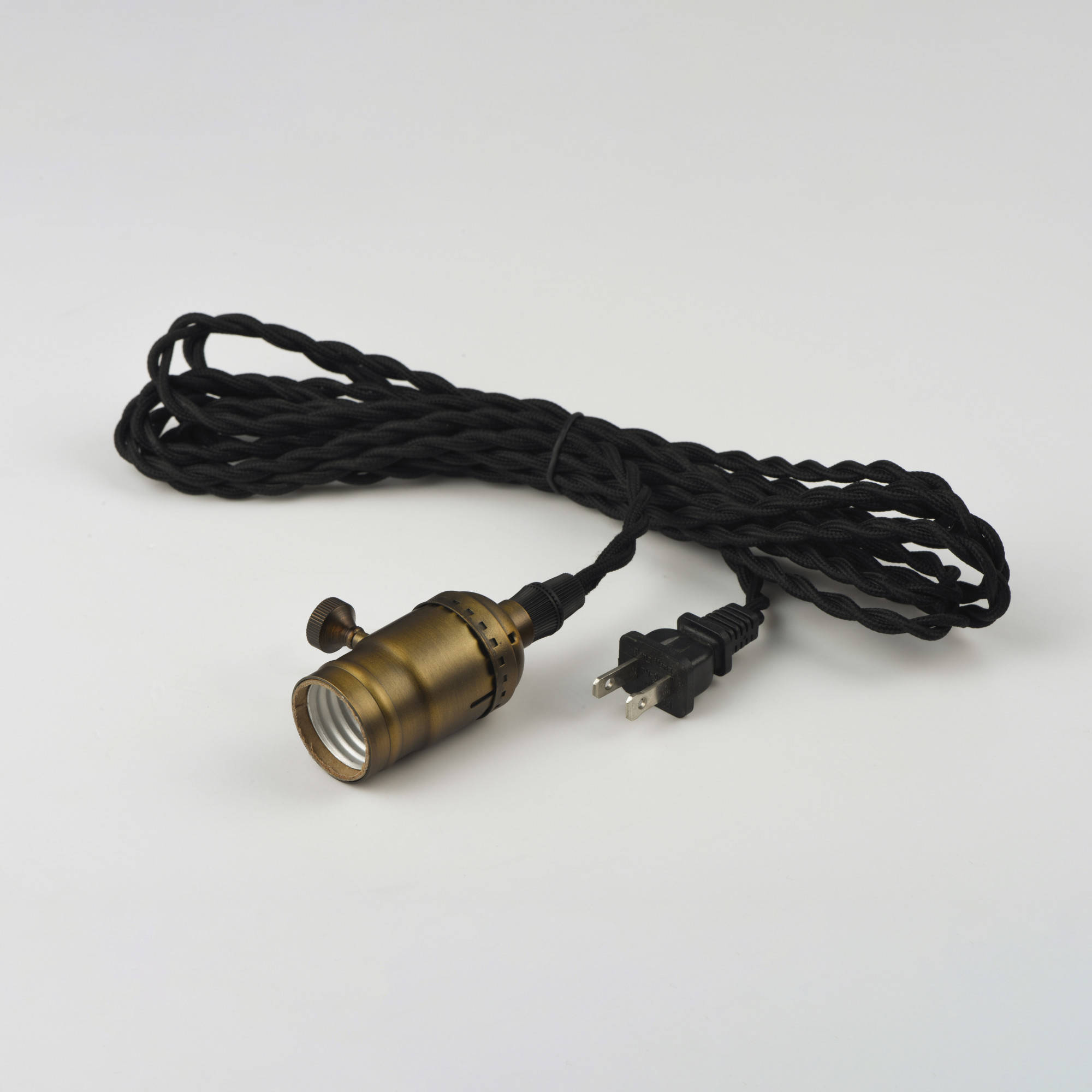 Item DescriptionCords of Black fabric support metal sockets finished in a natural Antique Brass allow you to create unique and fun lighting.